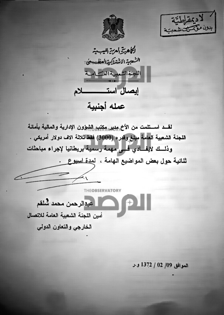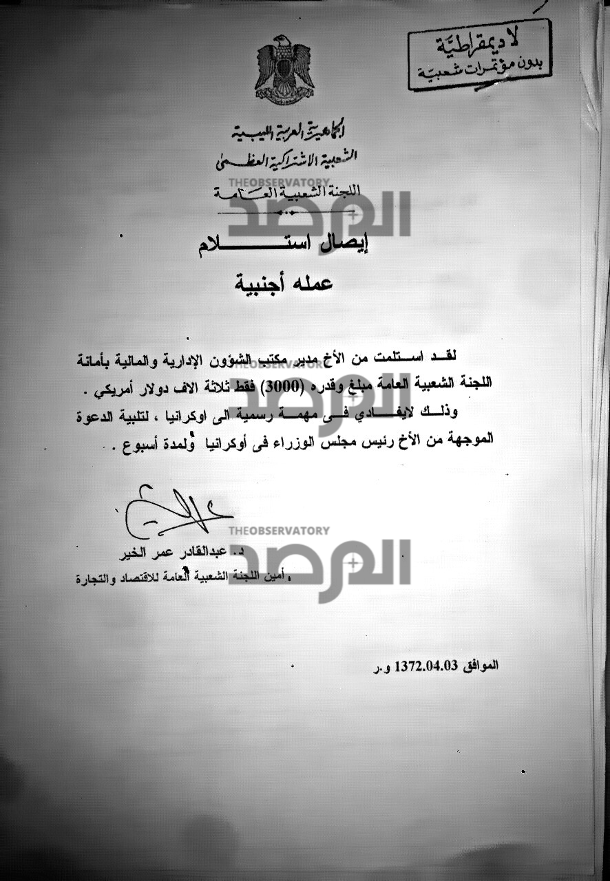 فى هذا المستند ترأس الراحل شكري غانم الوفد الذي ضم سيالة الى أوكرانيا بصفته أميناً للجنة الشعبية العامة ( رئيس وزراء ) ووفقاً للاجراء المتبع فى وزارة الخارجية يظهر المستند التالي أن غانم ورغم كونه رئيساً للحكومة قد وقع أيضاً لموظف الشؤون المالية بالوزارة على إيصال إستلام لعلاوة مالية نظير ترأسه الوفد لمدة أسبوع بقيمة 5000 دولار .