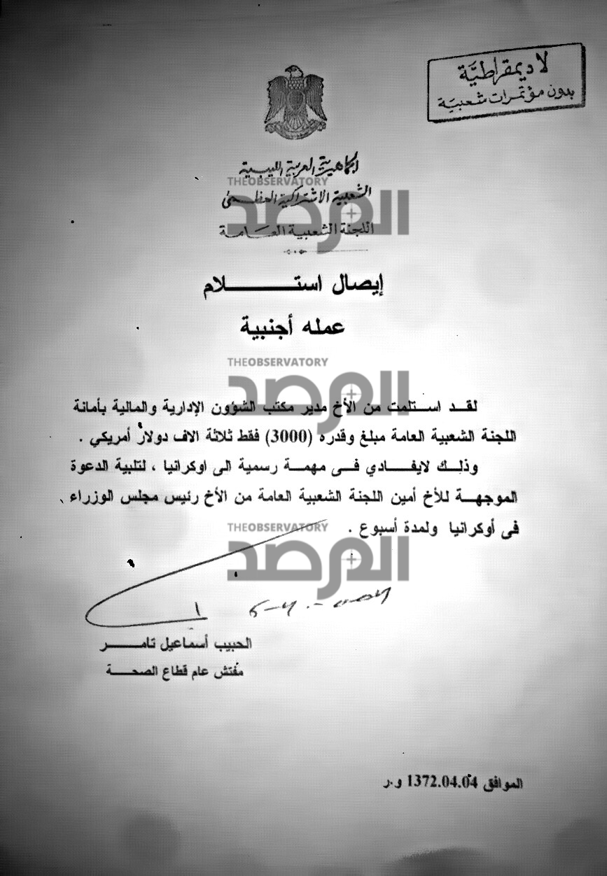 وفى هذا المستند يوقع أيضاً على إيصال مقابل تسلمه 3000 الاف دولار علاوة نظير سفره الى اوكرانيا ولمدة اسبوع فى مهمة رسمية تلبية لدعوة رئيس وزرائها .