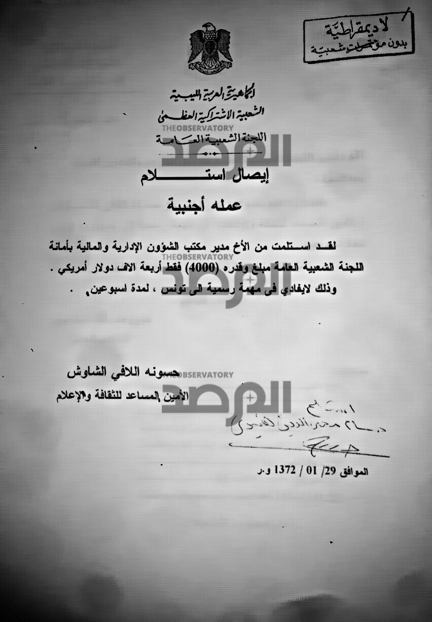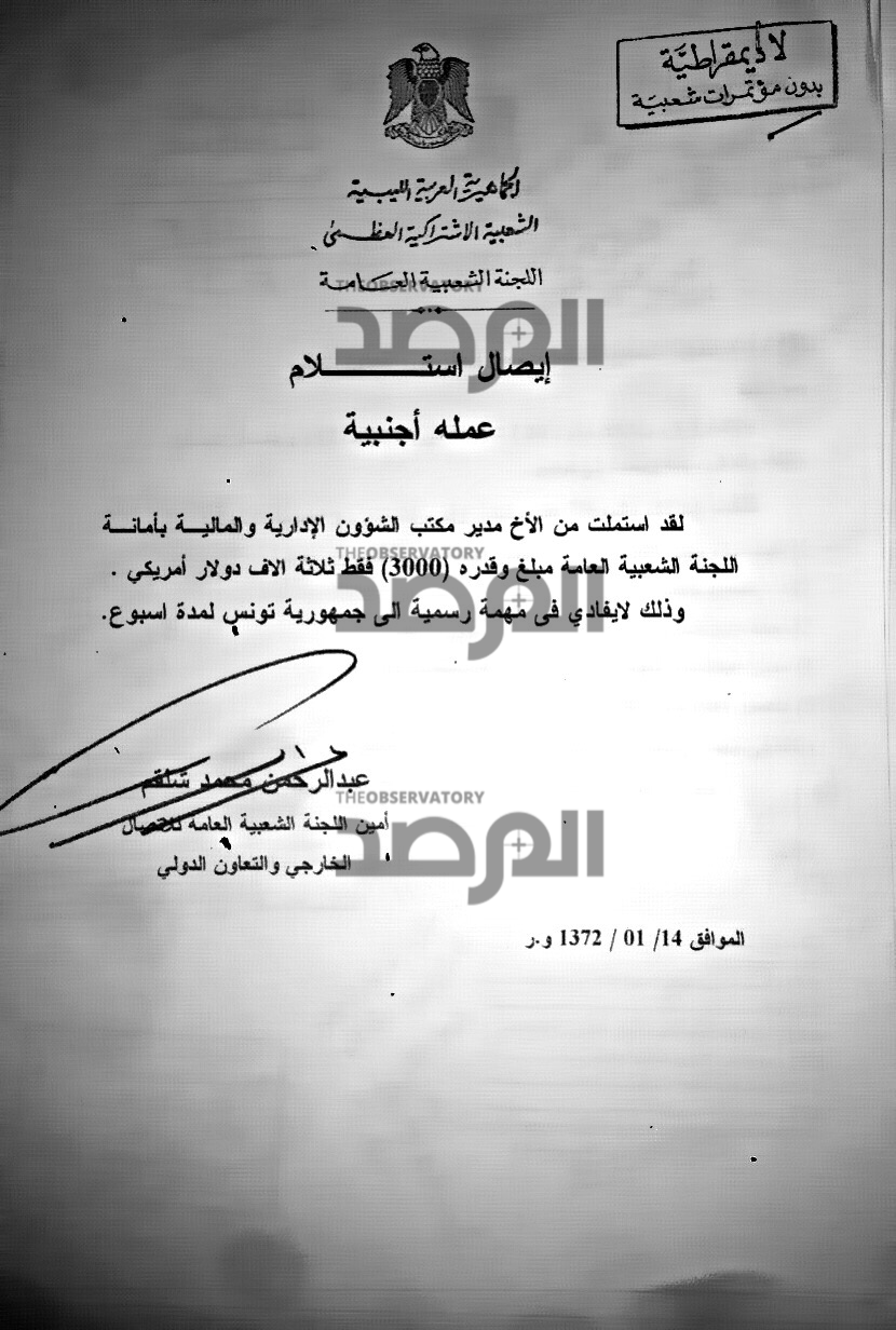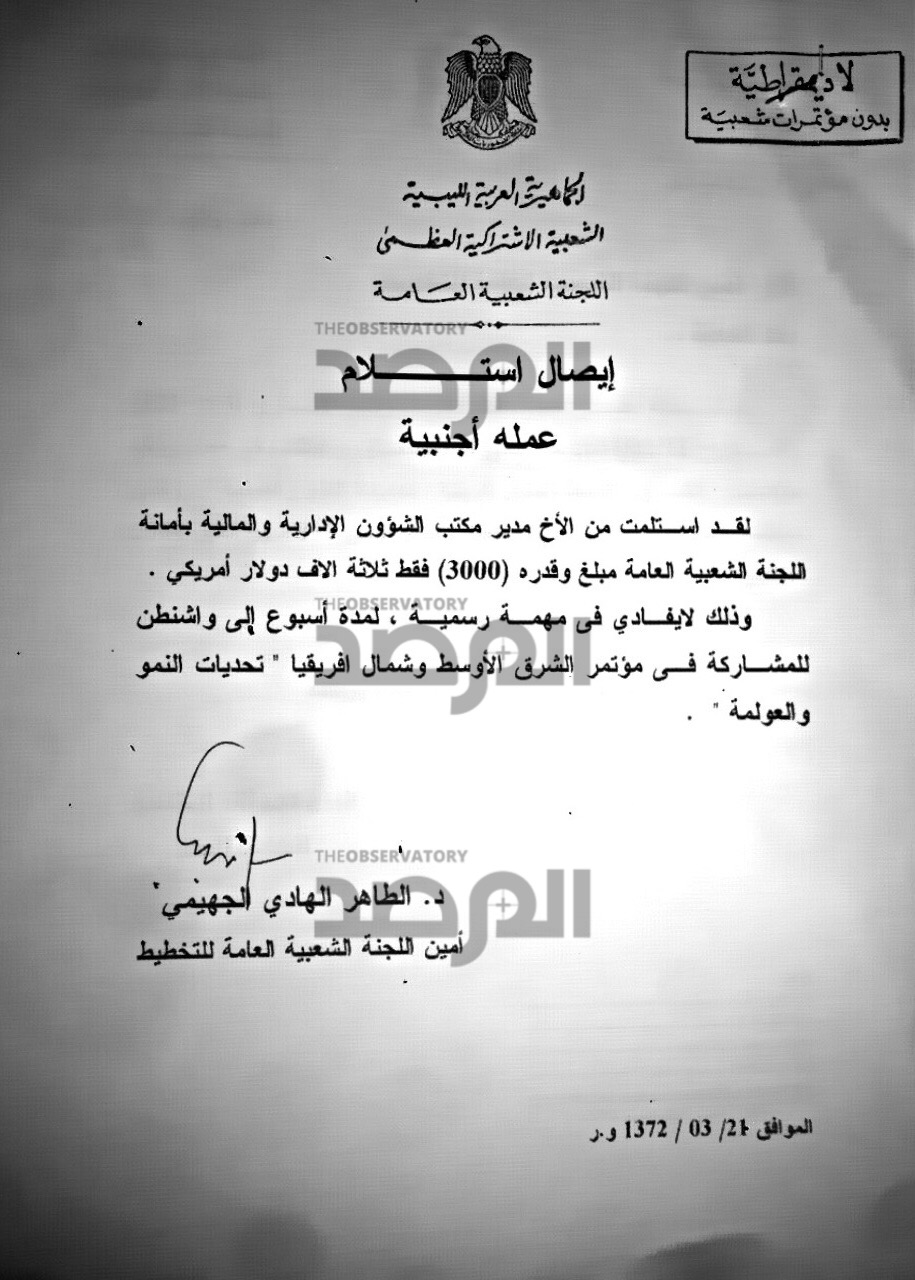 وعند البحث الذي اجرته المرصد فى بقية المستندات الخاصة بالوزير الجهيمي ، كانت المصادفة ممثلة فى هذا المستند الذي يحمل توقيعه ويعود تاريخه لسنة 2005 وهو عبارة عن إيصال استلام نقدي وقع عليه مقابل الحصول على علاوة مالية بقيمة 3000 دولار للتوجه فى مهمة عمل الى الولايات المتحدة أيضاً التي سافر لها فى عهد حكومة الوفاق بتذكرة تبلغ قيمتها 83 الف دينار !