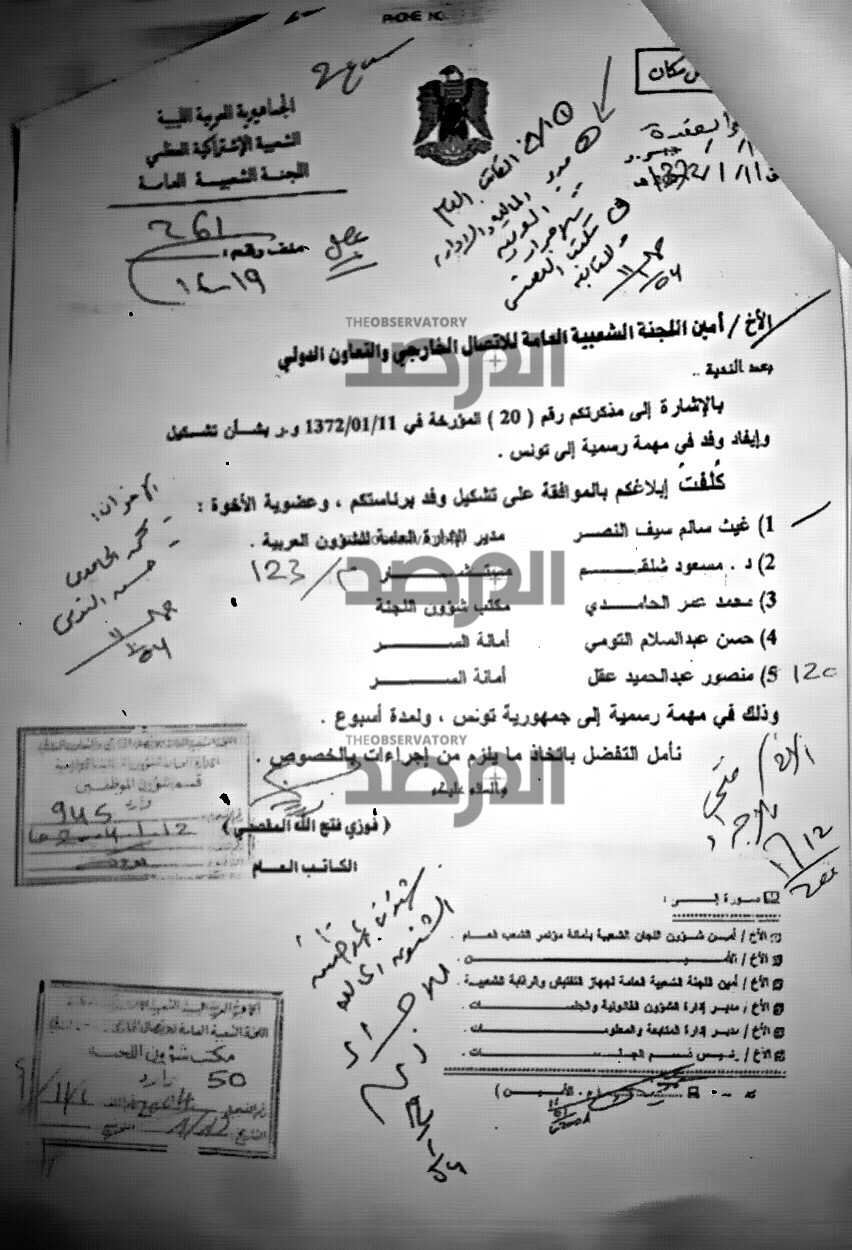 وبالنسبة لهذا المستند فيمكن من خلاله تصور وفهم مدى الالتزام بتنفيذ الاجراءات المالية والادارية بين ادارات وزارة الخارجية فى السابق ، حيث يتطلب سفر الوزير فى مهمة رسمية الى تونس موافقة رئيس الحكومة والتوقيع على ايصال مالي نظير العهدة المالية ومخاطبة السفارة لتسكينه ويتضح هذا من حجم التواقيع ( التهميشات ) على هذا المستند مثلاً .