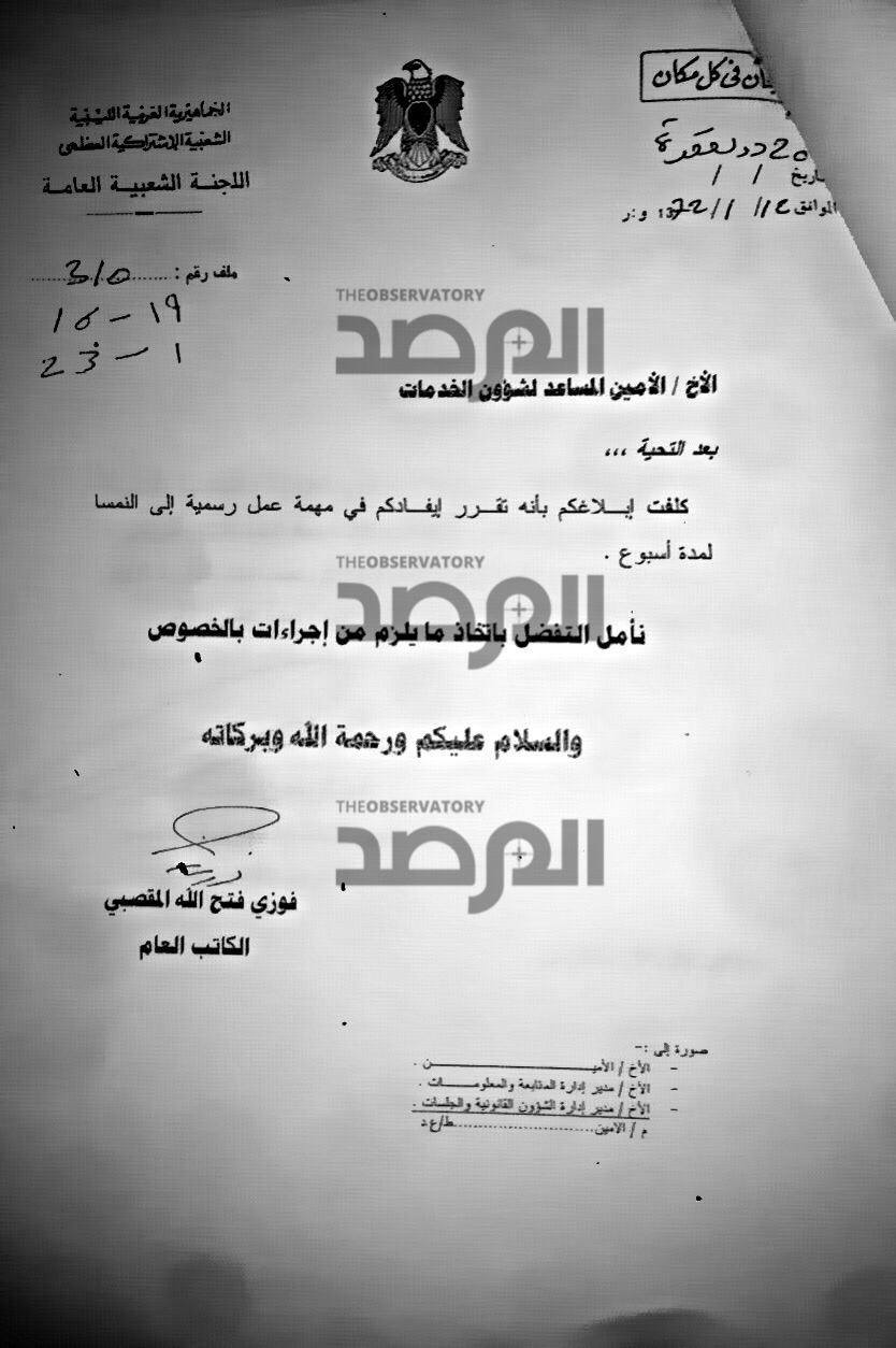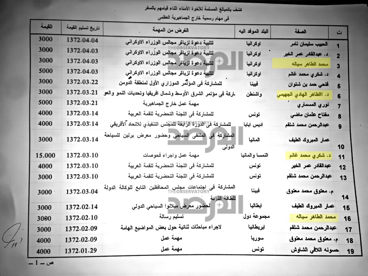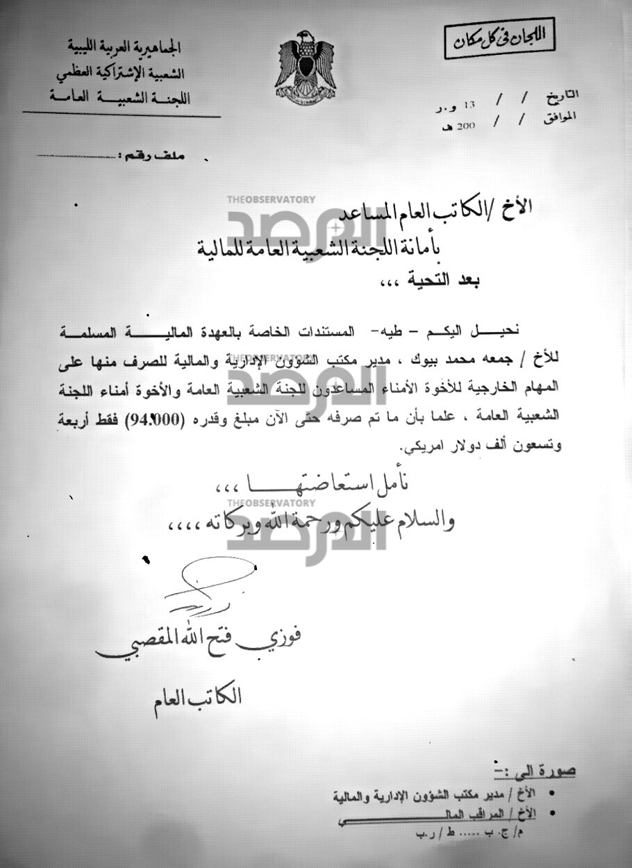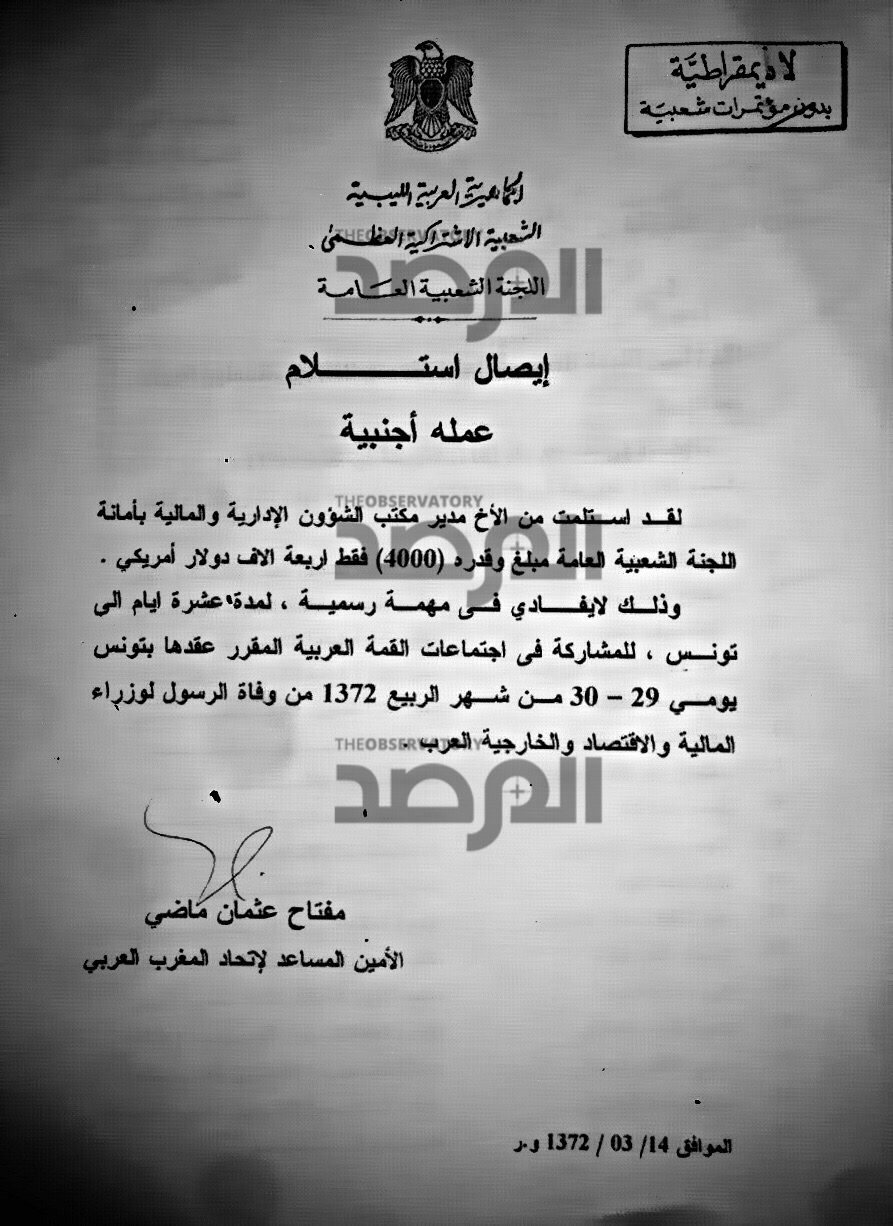 كما ان الاجراء فى وزارة الخارجية كان يحتم على وكيل الوزارة حينها فتحي المقصبي ان يخاطب نظيره فى وزارة المالية بحجم مصروفاتهم من العهد على المسؤولين والوزراء معززة باذونات الصرف وواصلات الاستلام وغرض السفر واسبابه ، كما هو فى هذا المستند .