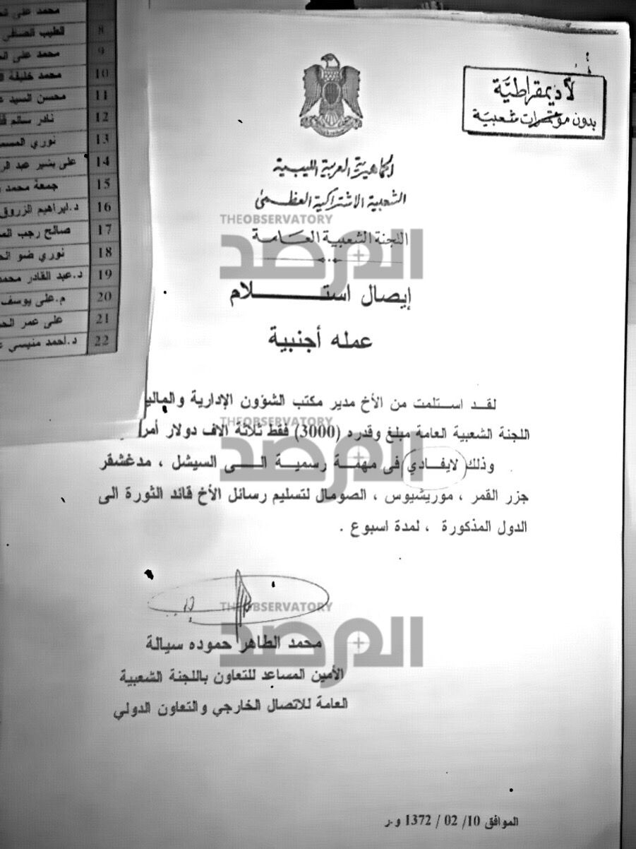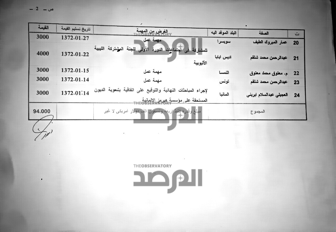فى هذا المستند ، وهو عبارة عن كشف سنوي قدمه وكيل وزارة الخارجية الى وزيره حينها عبدالرحمن شلقم والجهات المختصة الأخرى حول الاموال المقدمة للوزراء كعُهد نظير قيامهم بمهام خارجية وتتمثل المفاجأة الثانية وهي أن اجمالي مصروفات هذا الباب طيلة سنة 2006 لعدد 24 وزير كانت 94 الف دولار فقط جميعها معززة بالمستندات ومنها 20 الف صرفت لأبوزيد دوردة إبان إصابته بمرض القلب .
