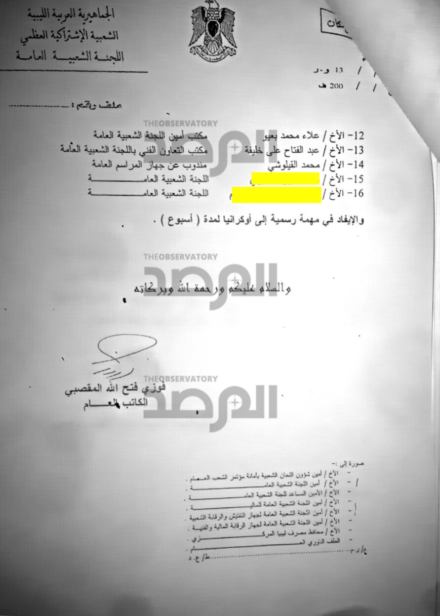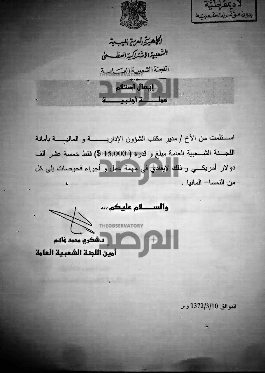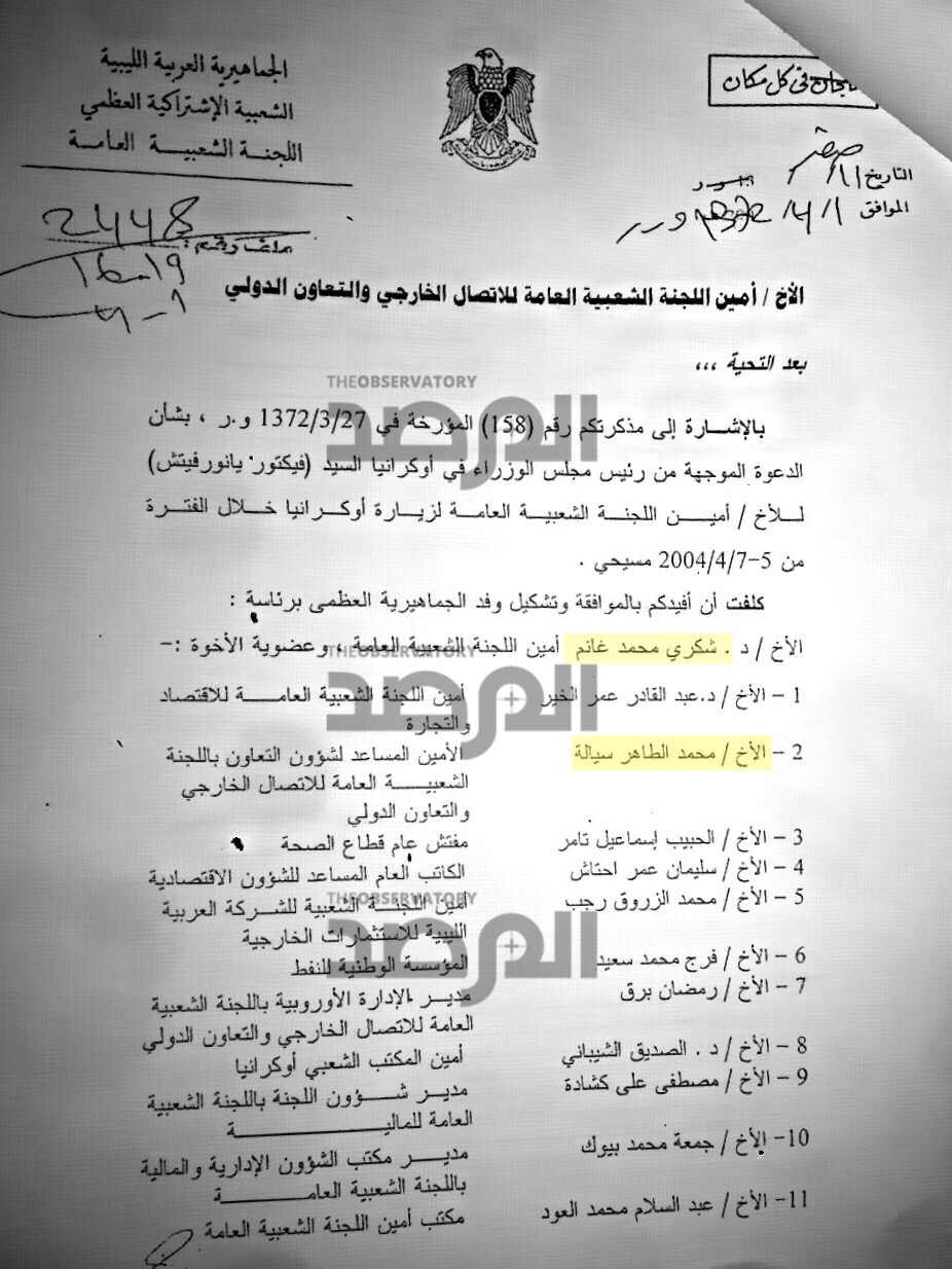 فى هذا المستند ترأس الراحل شكري غانم الوفد الذي ضم سيالة الى أوكرانيا بصفته أميناً للجنة الشعبية العامة ( رئيس وزراء ) ووفقاً للاجراء المتبع فى وزارة الخارجية يظهر المستند التالي أن غانم ورغم كونه رئيساً للحكومة قد وقع أيضاً لموظف الشؤون المالية بالوزارة على إيصال إستلام لعلاوة مالية نظير ترأسه الوفد لمدة أسبوع بقيمة 5000 دولار .