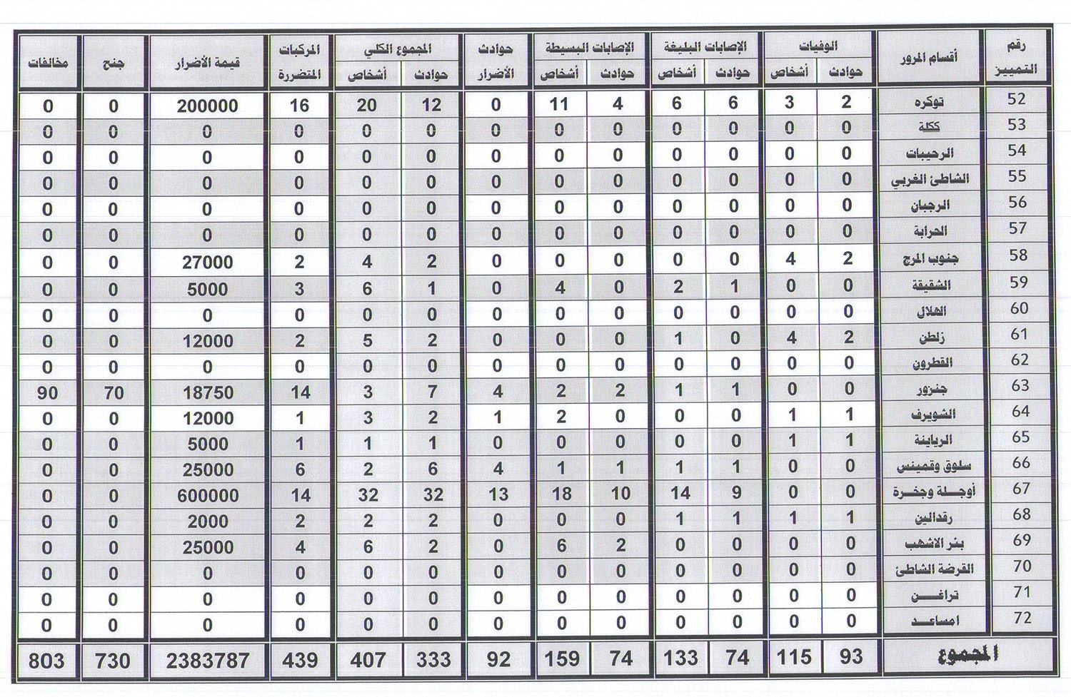 اما حجم الخسائر المالية والمادية جراء هذه الحوادث الـ333 فقد بلغ 2 مليون و 383 ألف دينار ليبي كما أوضحت الاحصائية ان من بين مالكي السيارات وحاملي رخص القيادة 61 وافداً اجنبياً .