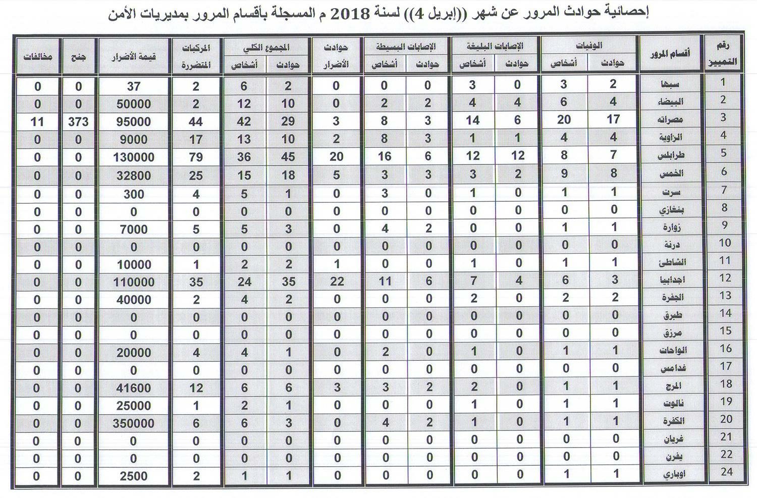 كما بينت إحصائية أبريل زيادة فى عدد الحوادث عن شهر مارس الذي سجل فيه 311 حادث الا ان وفيات مارس كانت اكثر حيث بلغت 122 حالة وفاة بواقع خسارة مالية ومادية بلغت 2 مليون و666 الف دينار ليبي .