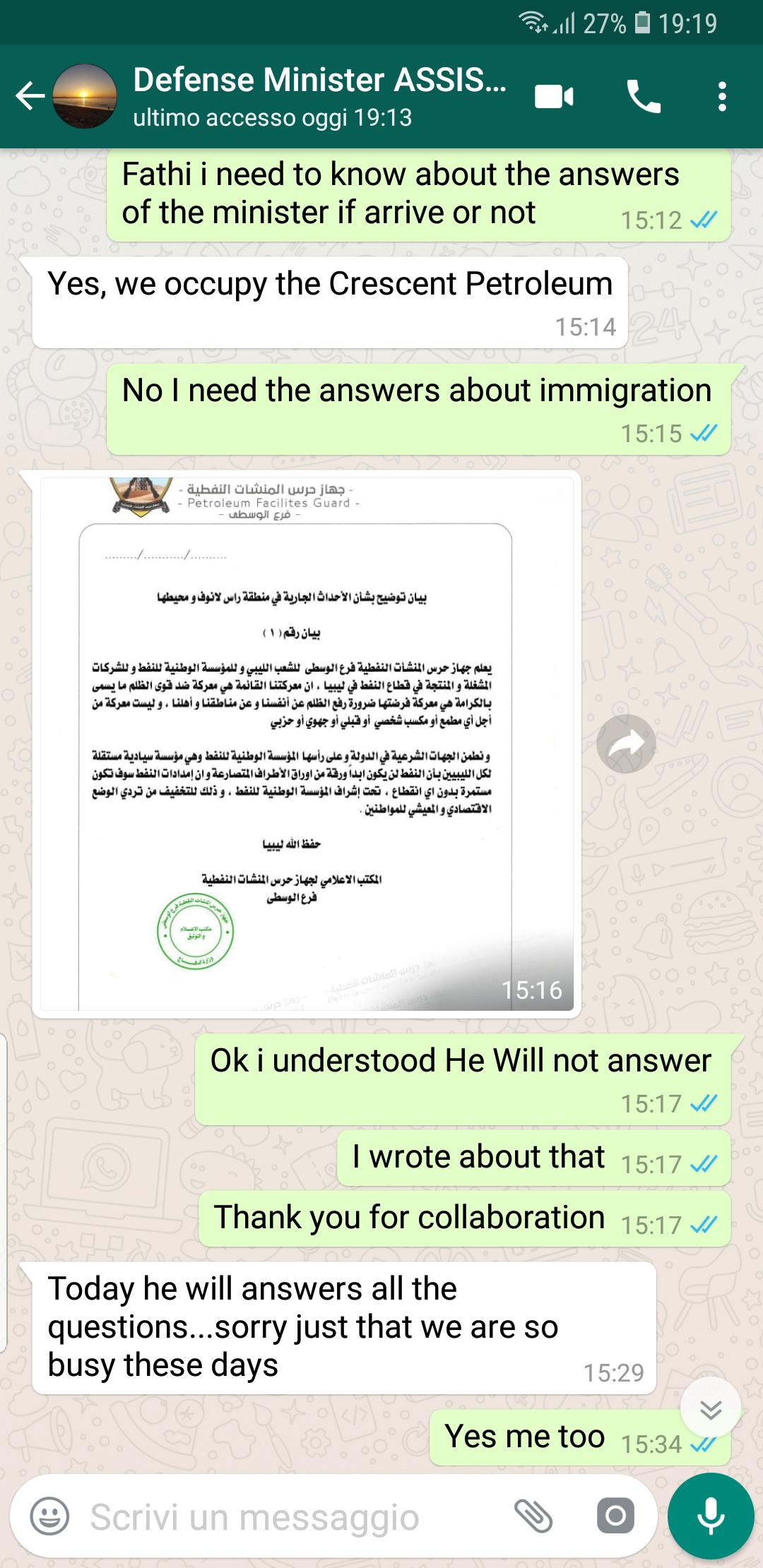 وفى هذا الصدد تواصل موقع ” سبيشل ليبيا ” الايطالي المعني بالشأن الليبي عبر أحد صحافييه مع المتحدث باسم وزير الدفاع المهدي البرغثي عبر تطبيق واتساب لاجراء مقابلة حول الهجرة غير الشرعية ليتفاجئ الصحفي بأن محاوره يتحدث عن هجوم جضران على المنطقة ، وفقاً لتقرير نشره الموقع ترجمته وتابعته صحيفة المرصد .