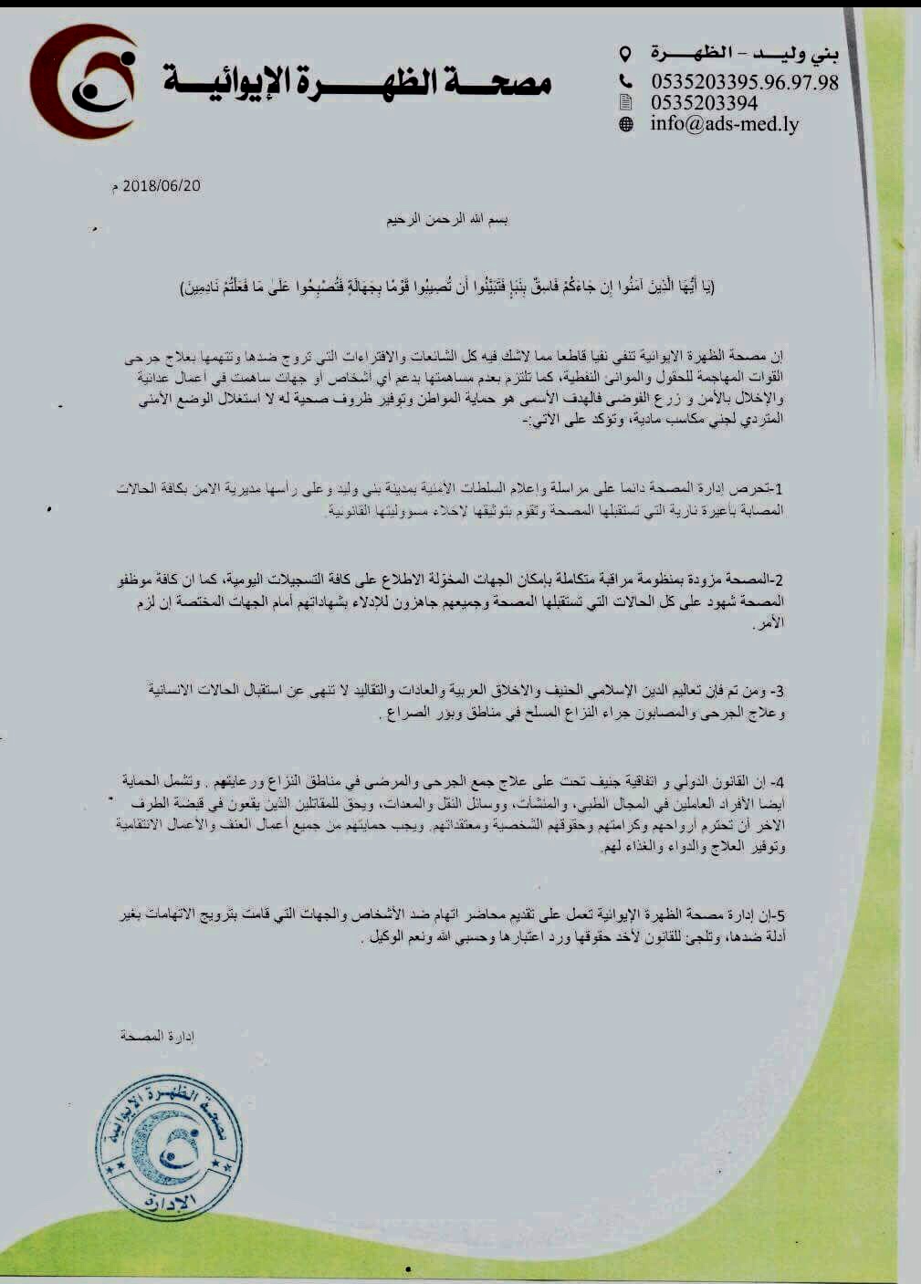 ليبيا – نفت مصحة الظهرة بمدينة بني وليد ، الأربعاء ، مايتداول عن إيوائها أي عناصر إرهابية او مسلحي ابراهيم جضران ومسانديه من المعارضة التشادية .
