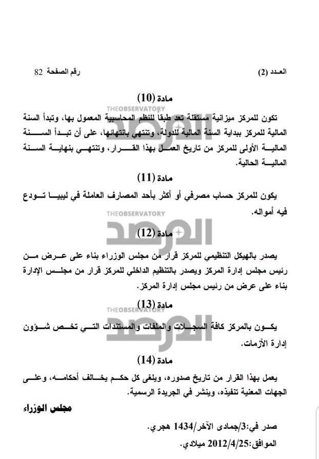 وقبل ذلك وتحديداً فى أبريل 2012 أعيدت تسمية المركز الليبي القطري باسم المركز الليبي للأزمات وفقاً لقرار صادر عن مجلس الوزراء فى ذلك الوقت وتحصلت صحيفة المرصد عليه حيث يشير القرار الى تخصيص ميزانية للمركز من الميزانية العامة على ان يكون له الحق فى تلقي الهبات والمساعدات والتبرعات وهو الأمر الذي تولته الاستخبارات القطرية عبر دفع أموال له تحت هذا الباب فيما واصلت قناة الجزيرة تغطيتها وإستضافتها وإهتمامها البالغ بناصر المانع دوناً عن بقية أعضاء الجماعة .