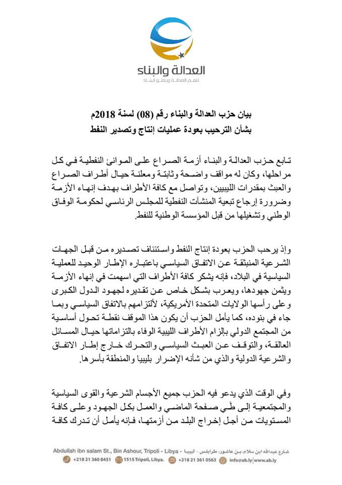 حزب العدالة والبناء رحب في بيان له اطلعت عليه المرصد أمس الاربعاء بعودة إنتاج النفط واستئناف تصديره من قبل ما وصفها بـ”الجهات الشرعية المنبثقة عن الاتفاق السياسي” باعتباره الإطار الوحيد للعملية السياسية في البلاد.