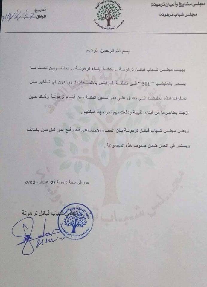ليبيا – دعا مجلس شباب قبائل ترهونة العناصر المنحدرة من قبائلهم والمنضويين تحت الكتيبة ” 301 ” التابعة لدفاع الوفاق في طرابلس إلى الإنسحاب منها فوراً دون أي تأخير .