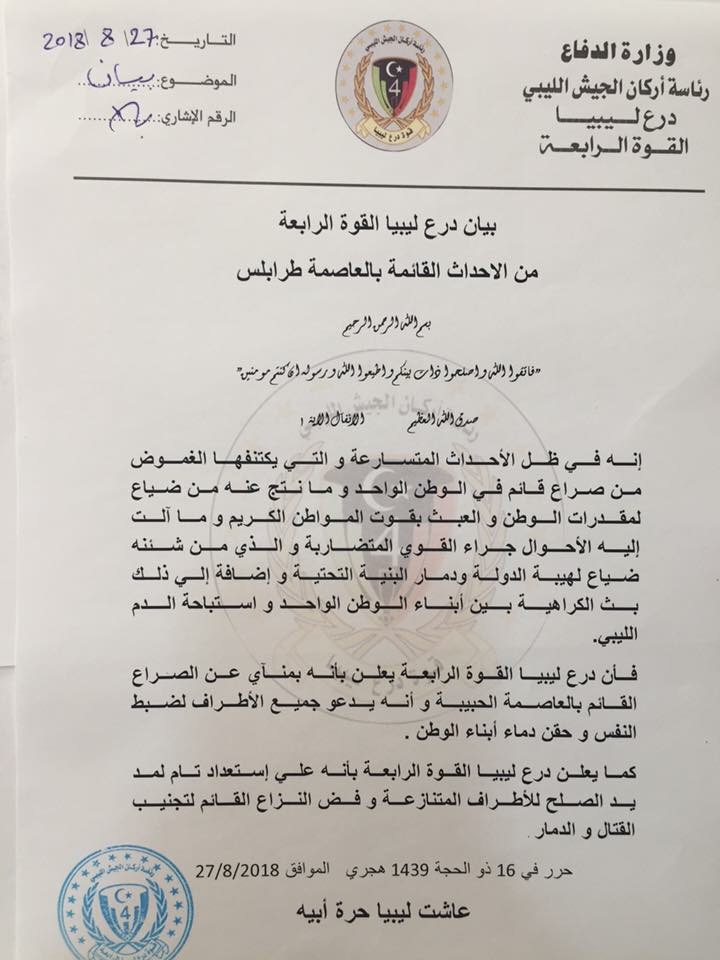 ليبيا – أصدرت القوة الرابعة التابعة لـقوات ” درع ليبيا ” فى غريان التابعة لدفاع وأركان الوفاق مساء الإربعاء بياناً حول الأحداث المتسارعة القائمة فى العاصمة طرابلس واصفة إياها بالأحداث التي يكتنفها الغموض وتدور بين أبناء الوطن الواحد .