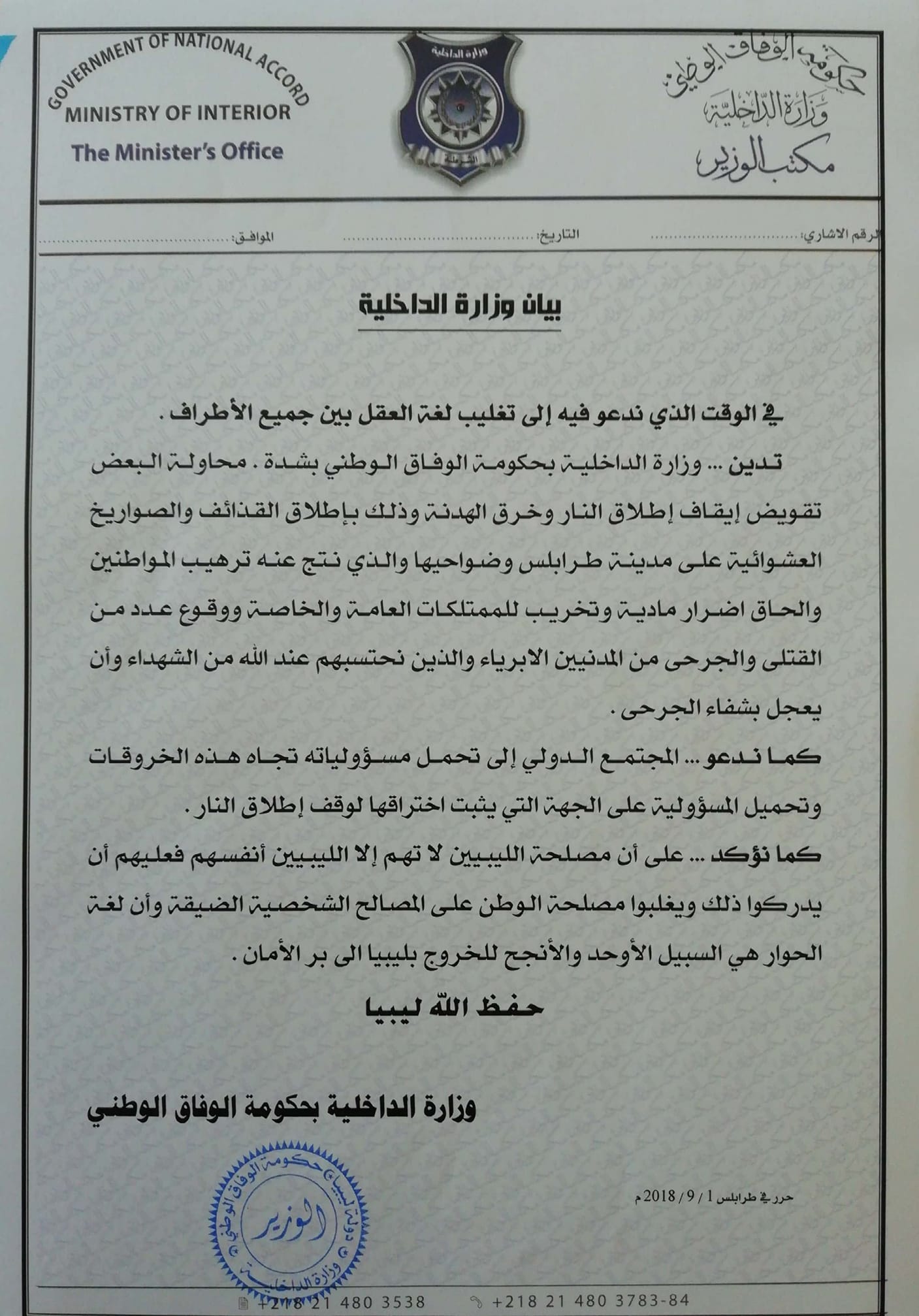 ليبيا – دانت داخلية الوفاق في بيان لها اليوم السبت بشدة محاولة البعض تقويض إيقاف إطلاق النار وخرق الهدنة باطلاق القذائف والصواريخ العشوائية على مدينة طرابلس وضواحيها ، مبينةً بأن ذلك أدى إلى ترهيب المواطنين والحاق أضرار مادية وتخريب الممتلكات العامة والخاصة.