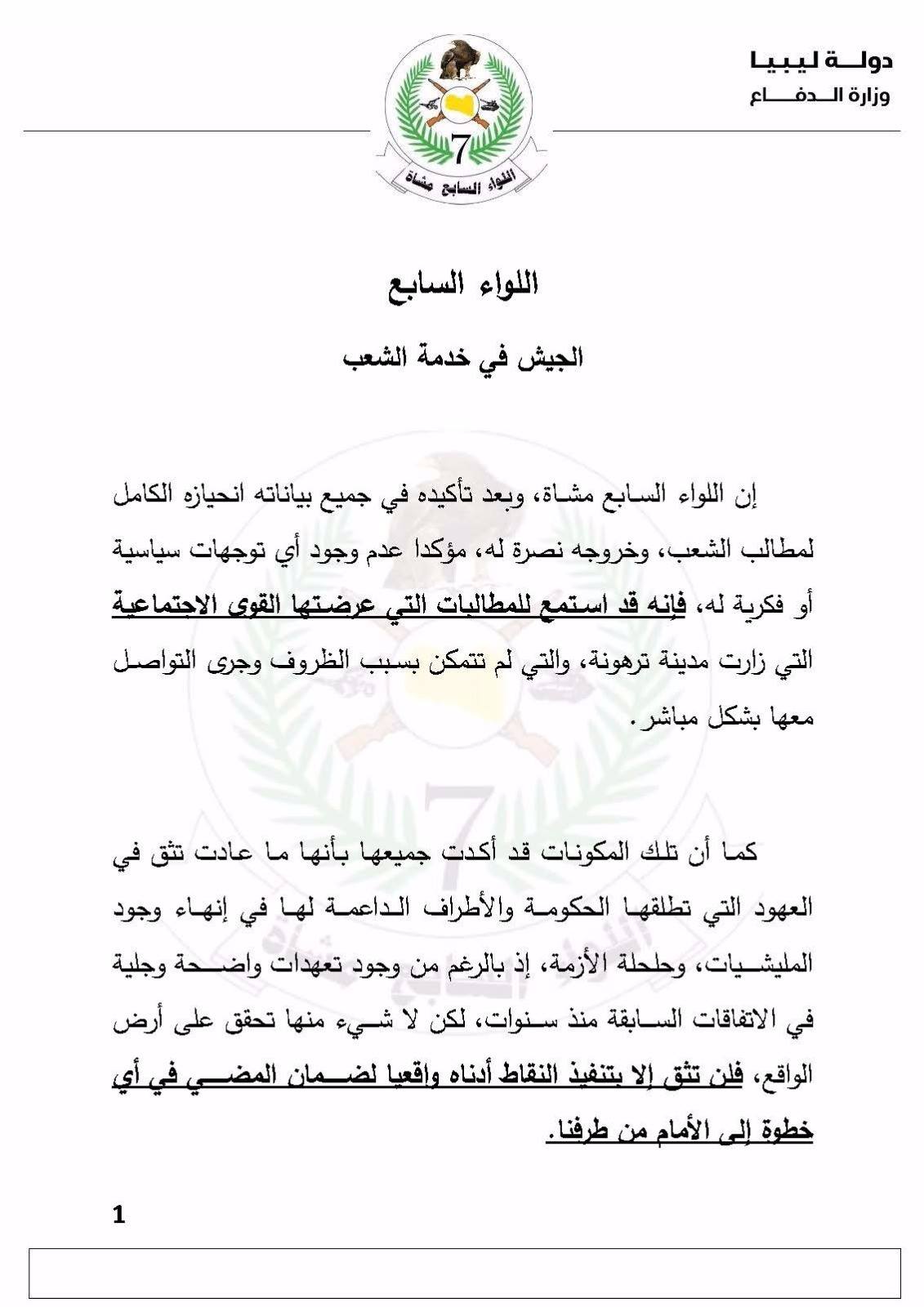 اللواء السابع أوضح في بيانه الذي تلقت المرصد نسخة منه بأنه قد استمع للمطالبات التي عرضتها القوى الاجتماعية التي زارت مدينة ترهونة، والتي لم تتمكن من زيارة المدينة بسبب الظروف وجرى التواصل معها بشكل مباشر.