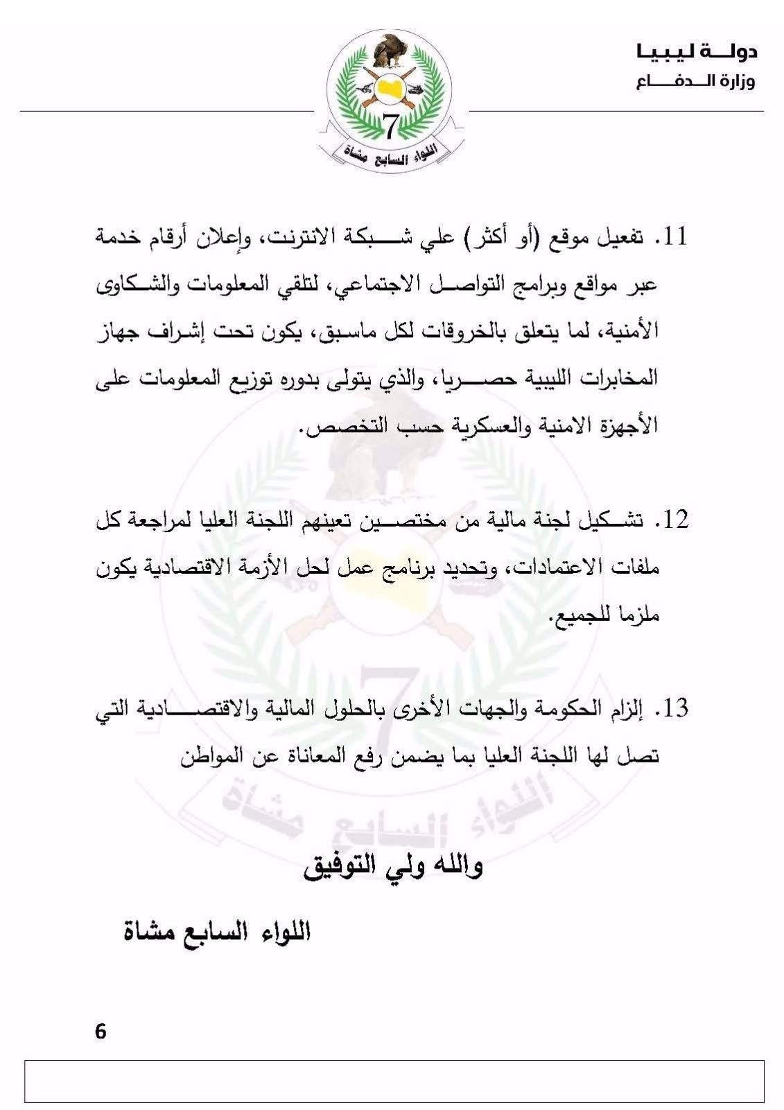 وقال :” تفعيل موقع (أو أكثر) علي شبكة الانترنت، وإعلان أرقام خدمة عبر مواقع وبرامج التواصل الاجتماعي، لتلقي المعلومات والشكاوى الأمنية، لما يتعلق بالخروقات لكل ماسبق، يكون تحت إشراف جهاز المخابرات الليبية حصرياً، والذي يتولى بدوره توزيع المعلومات على الأجهزة الامنية والعسكرية حسب التخصص”.