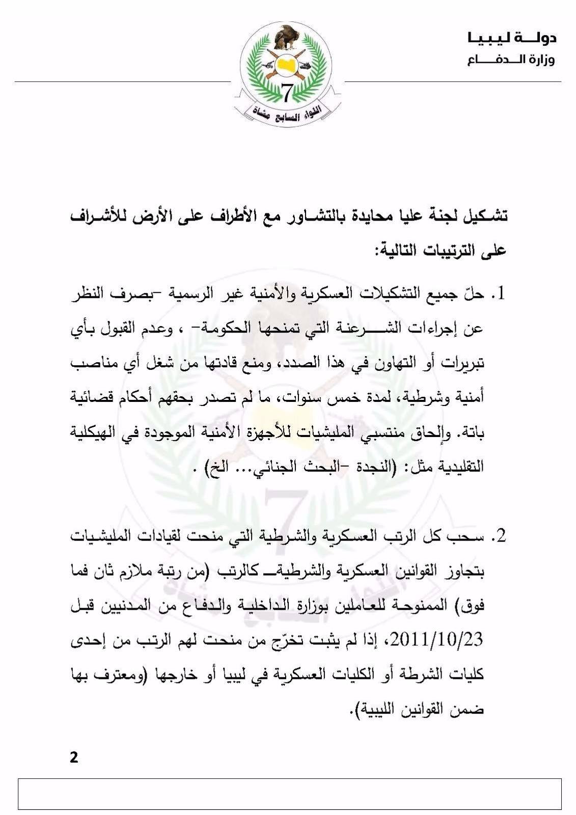 كما طالب اللواء بسحب كل الرتب العسكرية والشرطية التي منحت لقيادات المليشيات بتجاوز القوانين العسكرية والشرطيةـ كالرتب (من رتبة ملازم ثان فما فوق) الممنوحة للعاملين بوزارة الداخلية والدفاع من المدنيين قبل 23/10/2011، إذا لم يثبت تخرّج من منحت لهم الرتب من إحدى كليات الشرطة أو الكليات العسكرية في ليبيا أو خارجها (ومعترف بها ضمن القوانين الليبية).