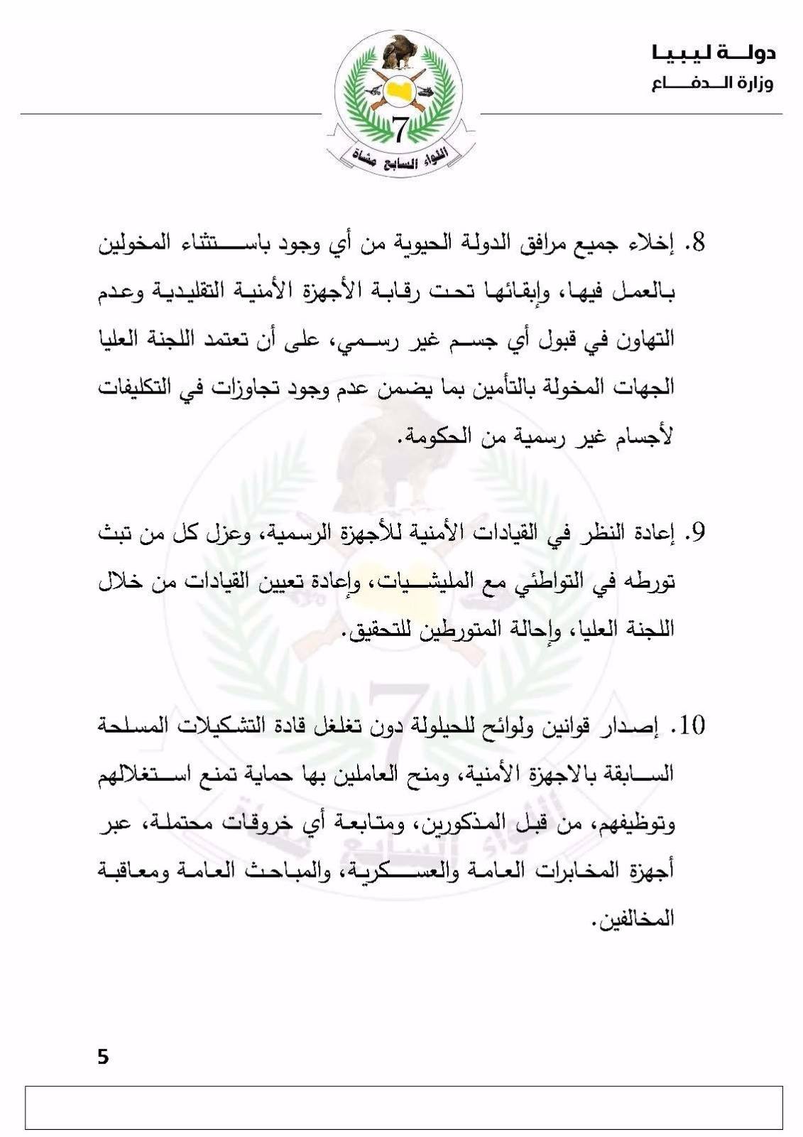 ودعا البيان إلى تأمن مدينة طرابلس من خلال قيادة شرطية عليا تؤسس وفقاً لما تعتمده اللجنة العليا المشكلة، وسحب كل الأسلحة الثقيلة من العاصمة، مطالباً وزارة الدفاع بالإلتزام بنقلها لمعسكراتها، وضمان عدم امكانية استخدامها، دون صدور الأوامر بحسب التراتبية المعمول بها في الجيش الليبي.