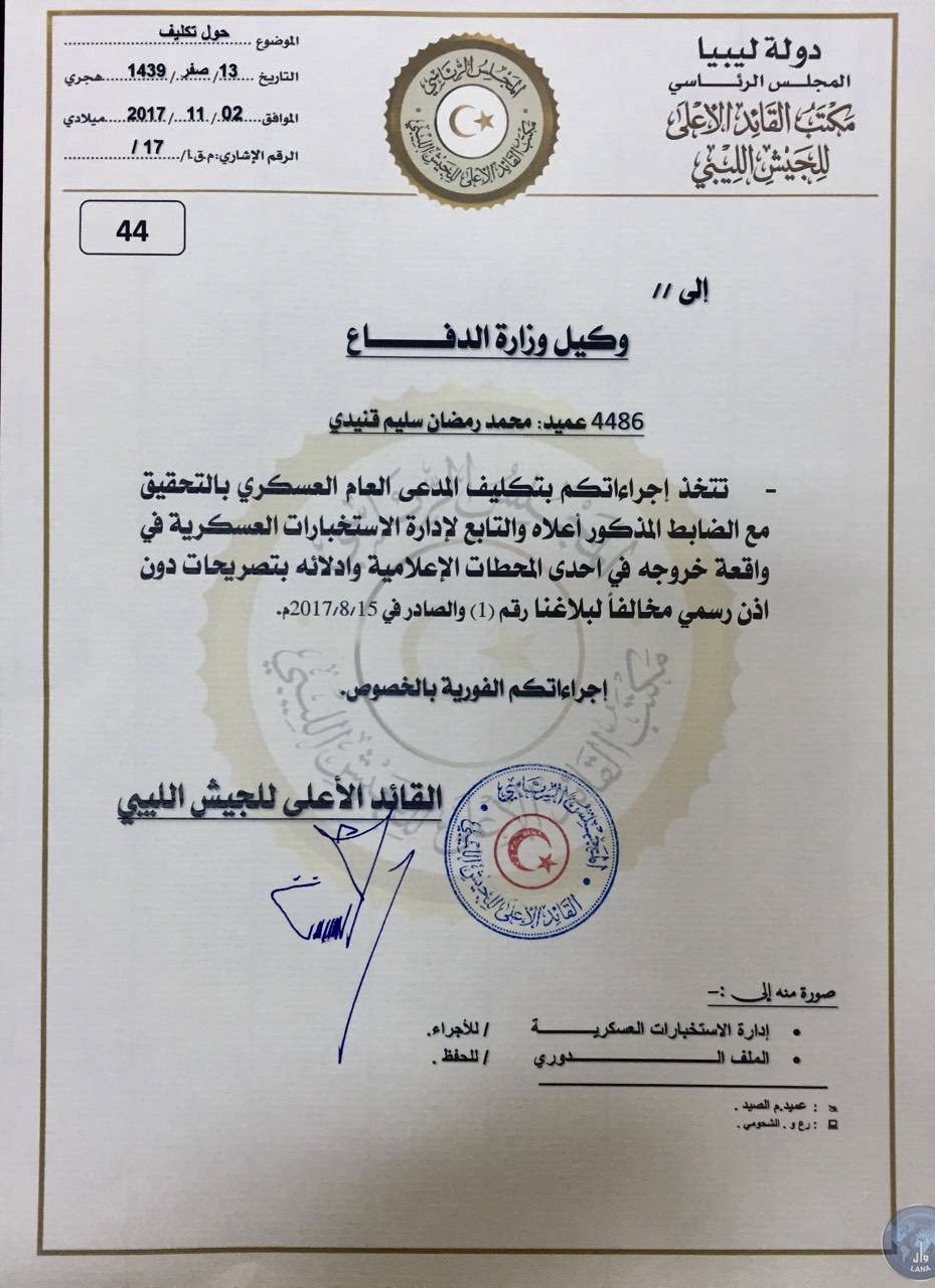 وكان رئيس المجلس الرئاسي فائز السراج قد أصدر قراراً فى 2 نوفمبر الماضي يقضي بوقف قنيدي عن العمل وإحالته للتحقيق وذلك على خلفية تصريحاته المثيرة التي هدد فيها القاهرة بعمليات إرهابية تبعها تصريحات إعلامية أخرى تحدى فيها السراج بالخروج مجدداً للإعلام رغم قرار إيقافه ومنعه عن التصريح .