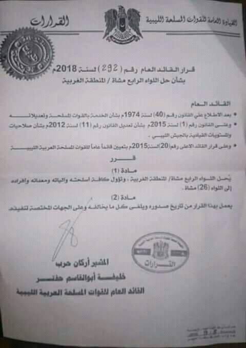 وفي سياق آخر قرر المشير حفتر حل اللواء الرابع مشاة/ المنطقة الغربية على أن تؤول كافة أسلحته وآلياته ومعداته وأفراده إلى اللواء (28) مشاة.