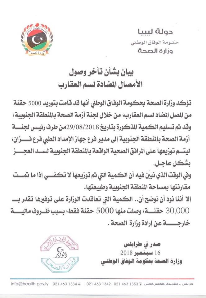 ليبيا – أصدرت وزارة الصحة بحكومة الوفاق بياناً بشأن تأخر وصول الأمصال المضادة لسم العقارب الى المنطقة الجنوبية مؤكدة تمكنها فقط من توريد 5000 حقنة من المصل عبر لجنة أزمة الصحة بالمنطقة.