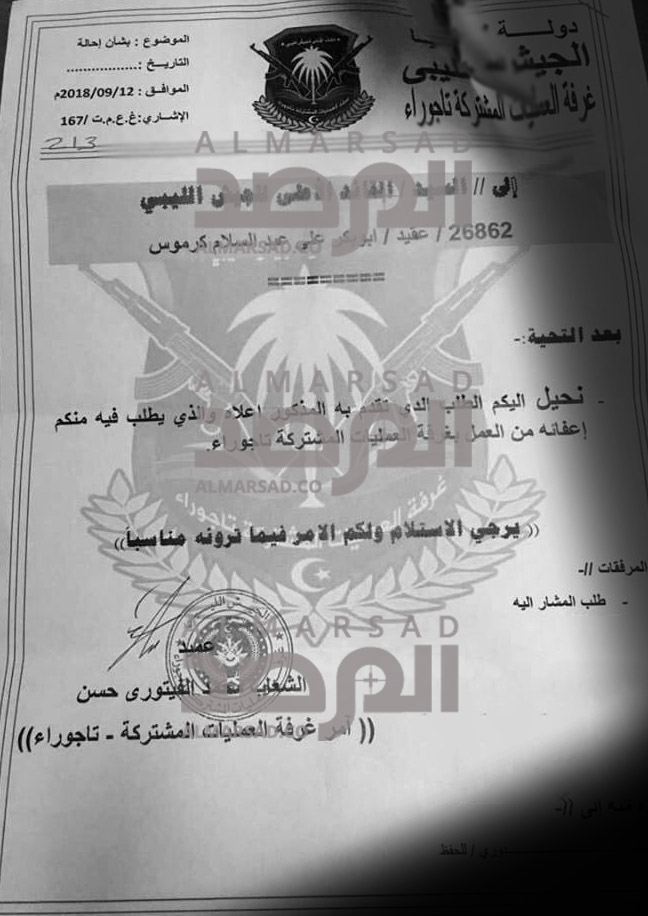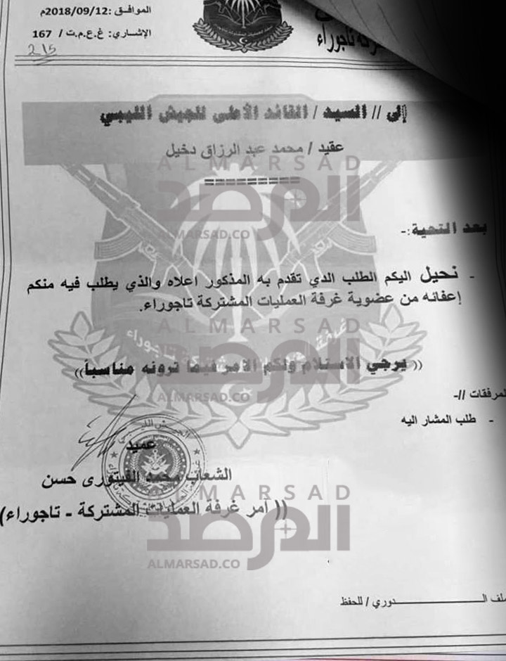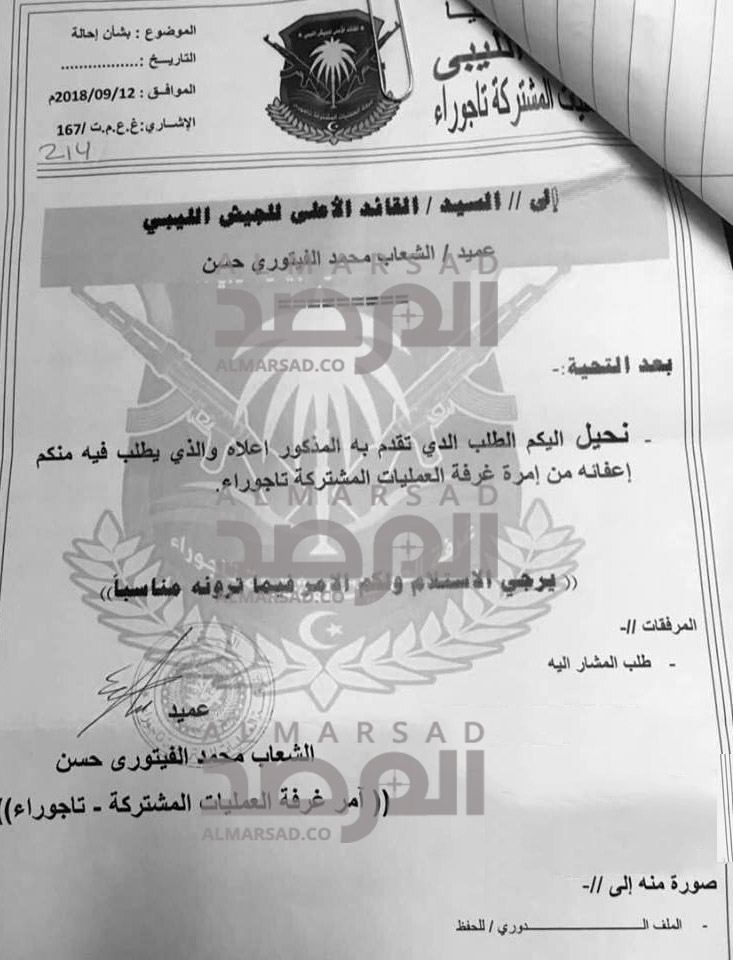 وتحصلت صحيفة المرصد على نسخة من الإستقالة التي قدمها آمر الغرفة عميد الشعاب الفيتوري باسمه وباسم بقية أعضائها إلى السراج .