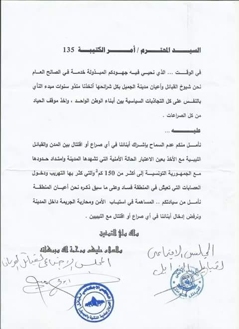 وأضافت القبائل في خطابها :” نأمل منكم عدم السماح بإشـراك أبنائنا في أي صراع أو قتال بين المدن والقبائل الليبية مع الأخذ بعين الاعتبار الحالة الأمنية التي تشهدها المدينة وامتداد حدودها مع الجمهورية التونسية إلى أكثر من 150 كم2 “.