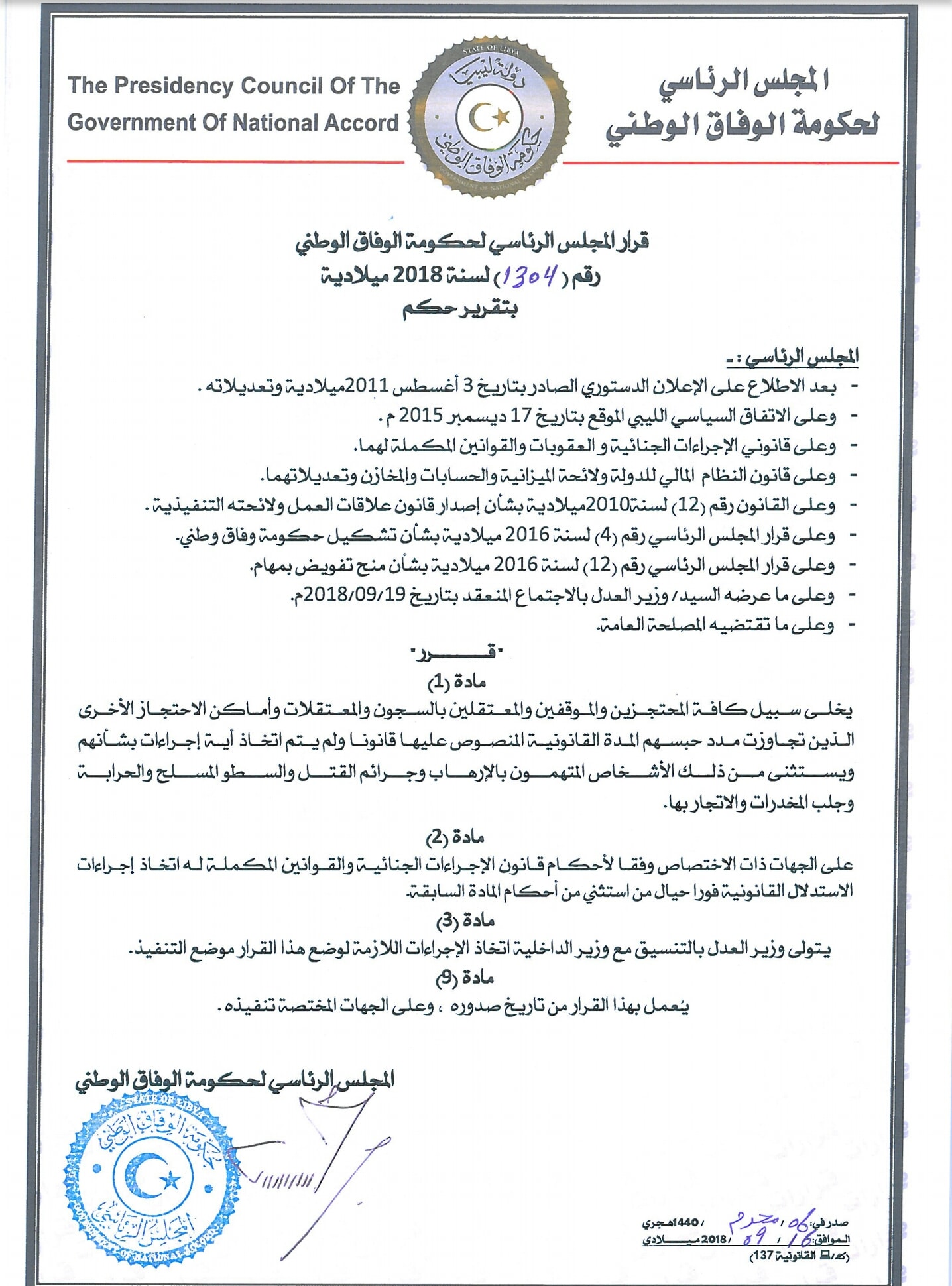 ليبيا – إعتبرت الجمعية القضائية في بيان لها أمس الثلاثاء بأن إصدار المجلس الرئاسي بتاريخ 16 سبتمبر 2018 القرار رقم 1301 / 2018 بشأن تشكيل لجنة قضائية تتولى أعمال التقصي عن وضع الموقوفين بسجن قاعدة معيتيقة وأصدره القرار رقم 1304 /2018 المتعلق بإخلاء سبيل كافة المحتجزين والموقوفين والمعتقلين الذين تجاوزت مدد حبسهم المدة القانونية غير قانوني وخالف للدستور.