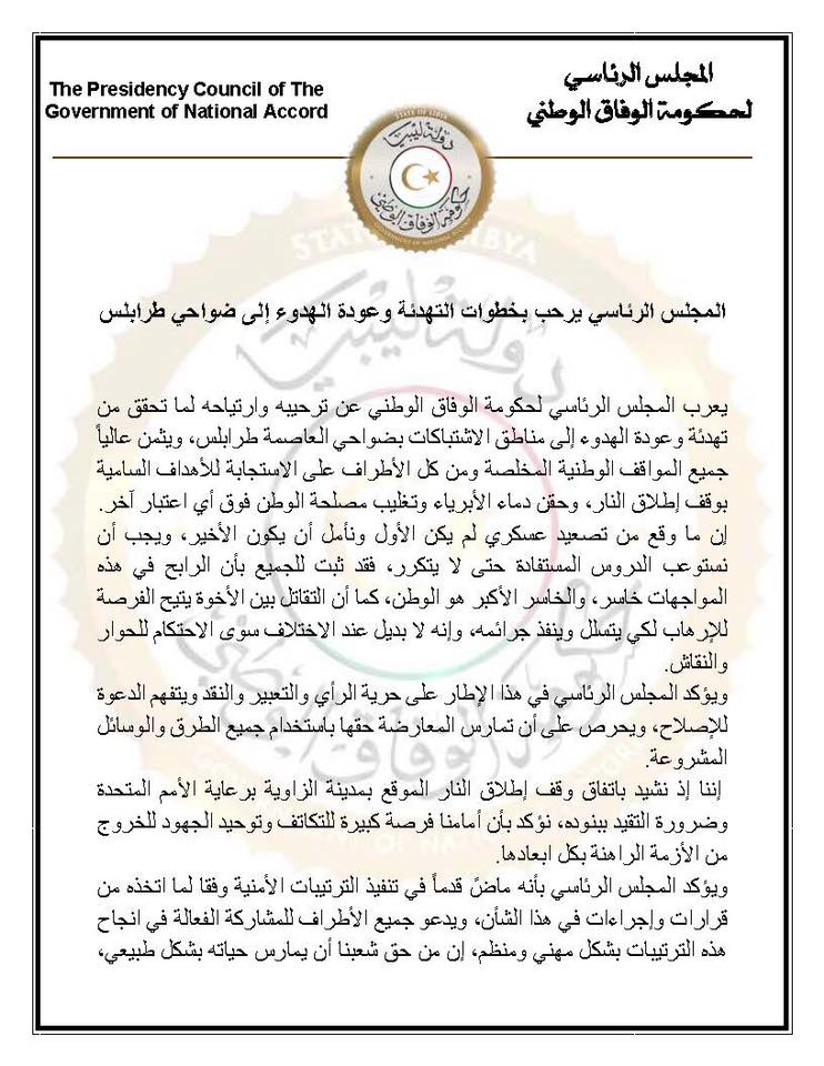 وأشاد في بيانه باتفاق وقف إطلاق النار الموقع بمدينة الزاوية برعاية الأمم المتحدة وضرورة التقيد ببنوده، مشيراً إلى أنه أمام الجميع فرصة كبيرة للتكاتف وتوحيد الجهود للخروج من الأزمة الراهنة بكل ابعادها.