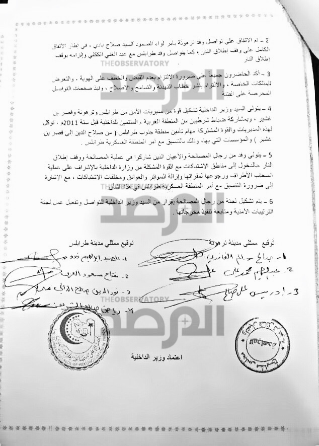 5 – يتولى وفد من رجال المصالحة والأعيان الذين شاركوا في عملية المصالحة ووقف إطلاق النار بالدخول الى مناطق الاشتباكات مع القوة المشكلة من وزارة الداخلية بالإشراف على عملية انسحاب الأطراف ورجوعها لمقراتها وإزالة السواتر والعوائق ومخلفات الاشتباكات ، مع الإشارة إلى ضرورة التنسيق مع أمر المنطقة العسكرية طرابلس في هذا الشان.