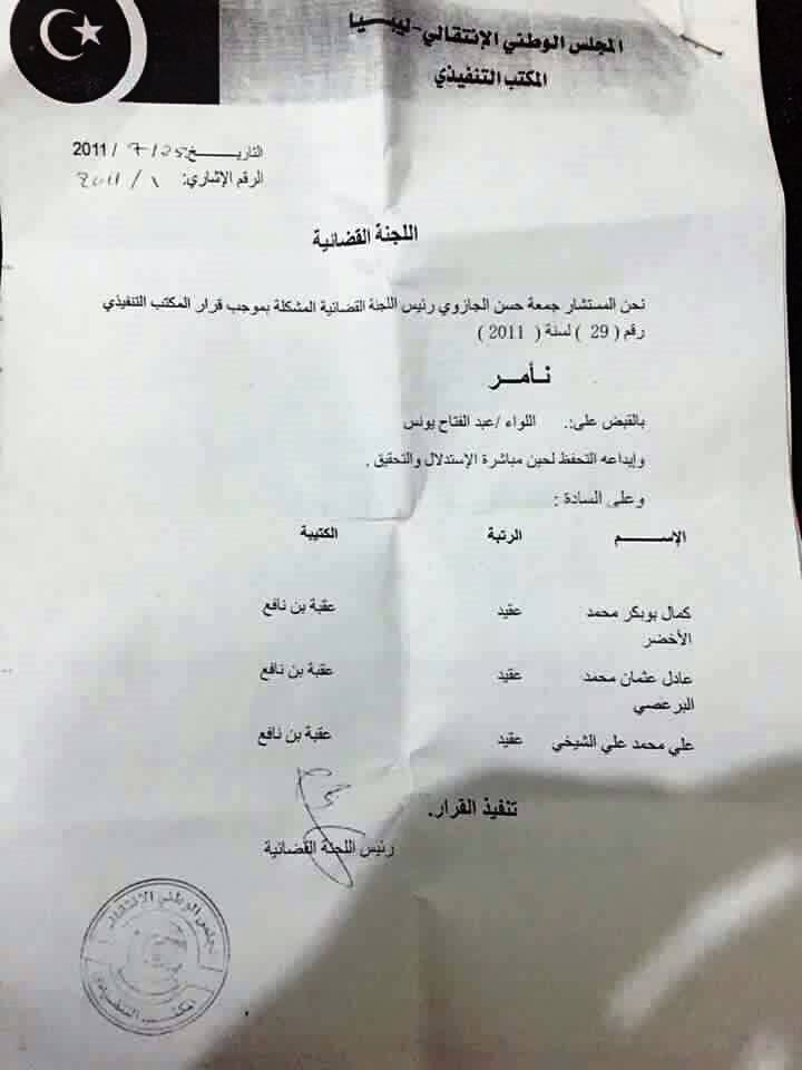 ومما قد يضفي المصداقية على حديث عبدالجليل بشأن وجود نية مبيتة لإغتيال يونس هو صدور أمر القبض عليه دون علم رئيس المكتب التنفيذي محمود جبريل الذي كان موجوداً فى بنغازي يوم صدور الأمر دون إخباره به حتى إنه عقد إجتماعاً فى اليوم التالي بكافة أعضاء المكتب بمن فيهم العيساوي الذي لم يشير للقبض لا من قريب ولا من بعيد ويعتبر جبريل هذا الأمر بأنه كان مقصوداً لمعرفتهم بعلاقته الوثيقة باللواء عبدالفتاح ولأنه كان سيقف ضد إعتقاله لأن الجهة المخولة بالتحقيق فى أي مخالفات محتملة هي النيابة العسكرية .