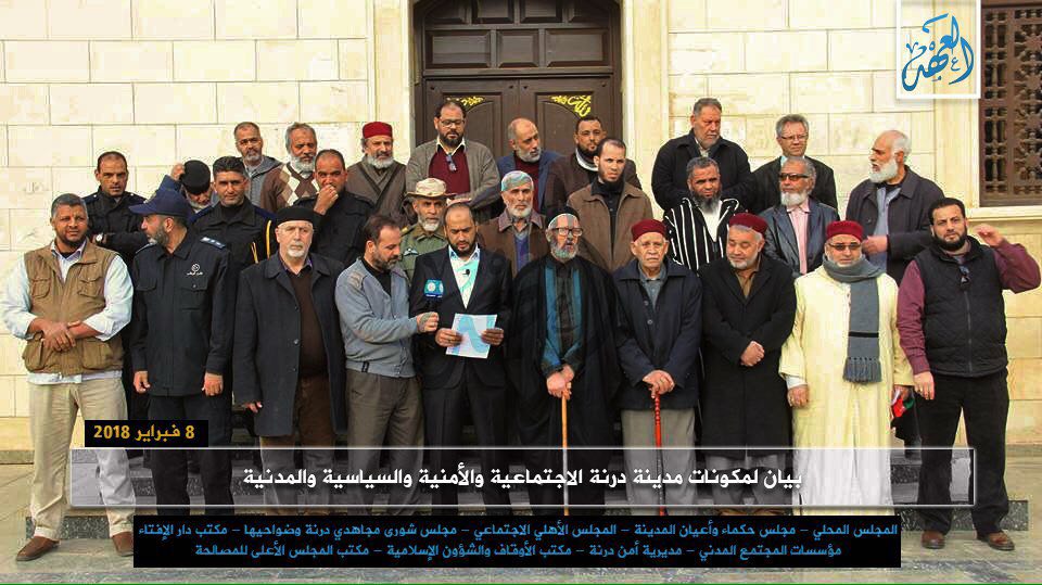 وفى تبرير لتصفية الشبان الثلاثة ، أصدر عدد من موالي وذوي قيادات شورى درنة بياناً يوم 8 فبراير الجاري بصفتهم ممثلي المدينة من النواحي الاجتماعية والمدنية والعسكرية والسياسية وأكدوا فيه على تمسكهم بميثاق المدينة وأن الممثل الشرعي لها هو المجلس المحلي ودعوا فيه إلى الحفاظ على النسيج الاجتماعي وردع كل من تسول له نفسه العبث بأمن المدينة كما دعوا فيه السلطات المحلية الليبية إلى التدخل الفوري لفك الحصار عنهم وإطلاق سراح المسجونين في سجون الجيش وتفعيل القضاء بالمدينة والعمل بالقوانين المعدلة من المؤتمر الوطني العام بعد إنتهاء ولايته والتي لائمها بالتنسيق مع المفتي الصادق الغرياني بالشريعة الاسلامية .