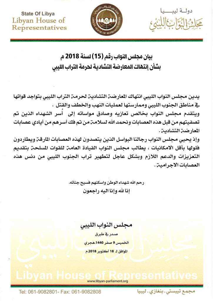 ليبيا – دان مجلس النواب في بيان له اليوم الخميس انتهاك المعارضة التشادية لحرمة التراب الليبي بتواجد قواتها في مناطق الجنوب وممارستها لعمليات النهب والخطف والقتل .