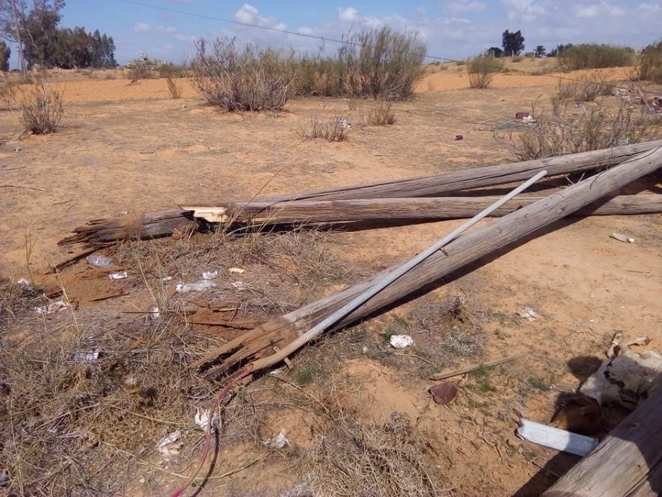 ليبيا – أعلنت الشركة العامة للكهرباء اليوم الأحد تعرض خط الكهرباء 11 ك.ف بمنطقة الطرش بقصر بن غشير جنوب طرابلس للإعتداء وسرقه الأسلاك مما تسبب في سقوط البرج والأعمدة وانقطاع الكهرباء عن المواطنين.