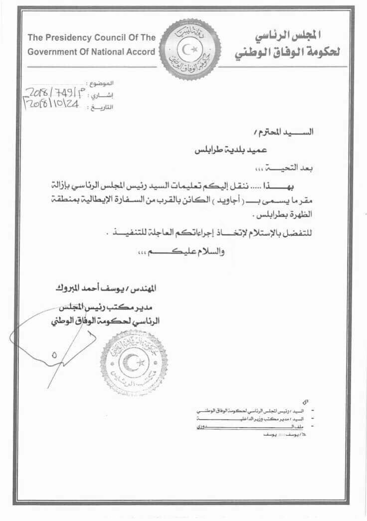 المرصد تلقت أيضاً خطاباً من السراج موجه إلى عميد بلدية طرابلس عبدالرؤوف بيت المال بشأن إزالة مقر دار أجاويد للإنتاج الفني الكائن بالقرب من السفارة الايطالبة بمنطقة الظهرة وسط طرابلس.
