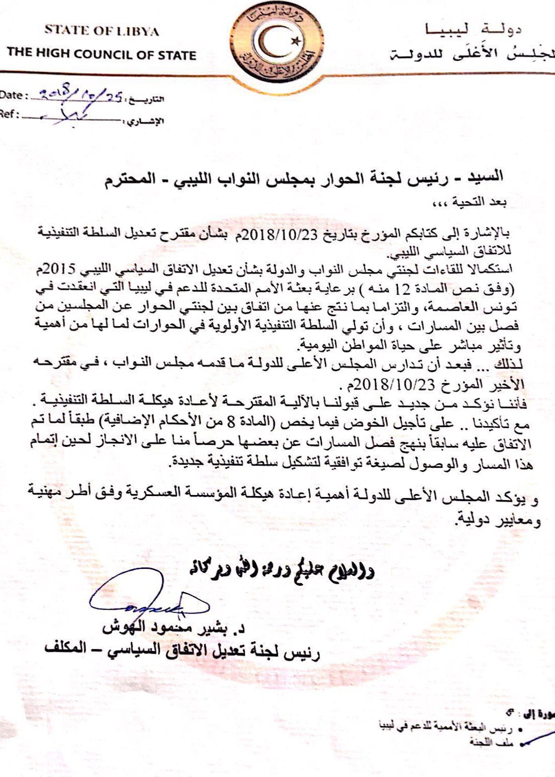 وختم رئيس لجنة حوار مجلس الدولة الإستشاري كتابه مشيراً إلى أهمية إعادة هيكلة المؤسسة العسكرية وفق أطر مهنية ومعايير دولية وذلك على حد قوله .