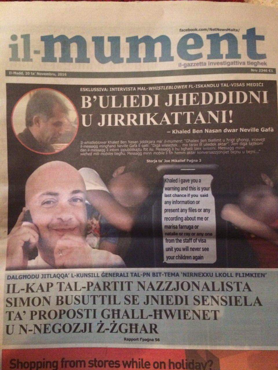 لاحقاً وفى ضمن إطار نفس القضية ، نشرت صحيفة ” إلمومنت ” المالطية رسالة تهديد لليبي بن نعسان يقول له فيها :” إذا تحدثت بأي معلومات أو قدمت أي ملف أو تسجيلات عني أو عن ماريسا فاروجا أو ناتالي أو راي ( موظفين فى قسم التأشيرات ) أو أي موظف فى القسم فلن ترى أولادك مجدداً ” . وقد نشرت ذات الصحيفة فى عدد آخر صوراً لأطفال بن عسان الذي هددهم هذا الشخص بالتسبب لهم فى الأذى .