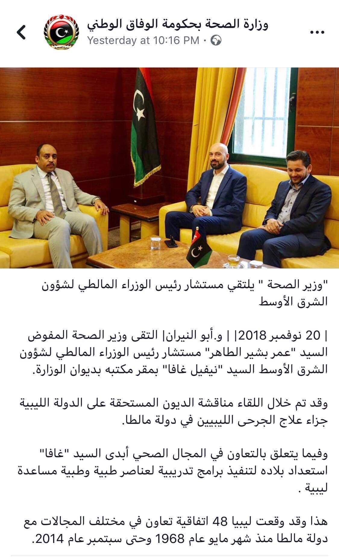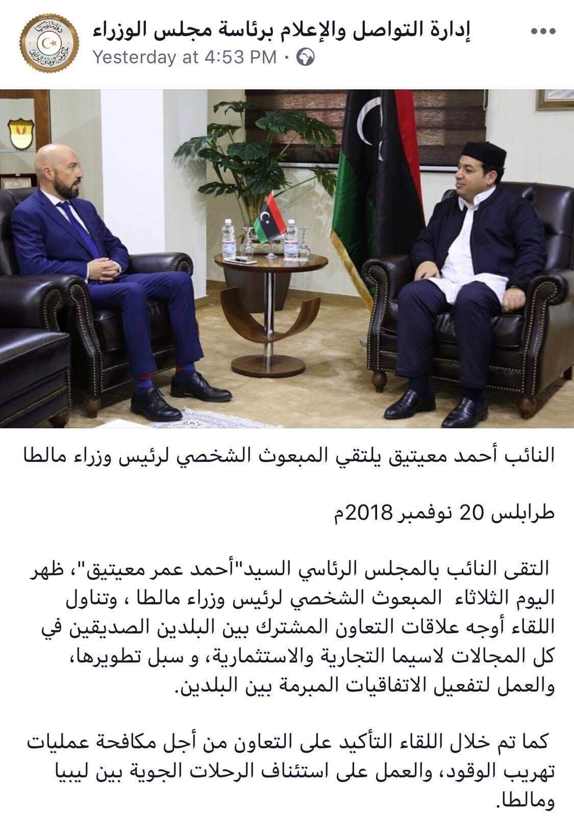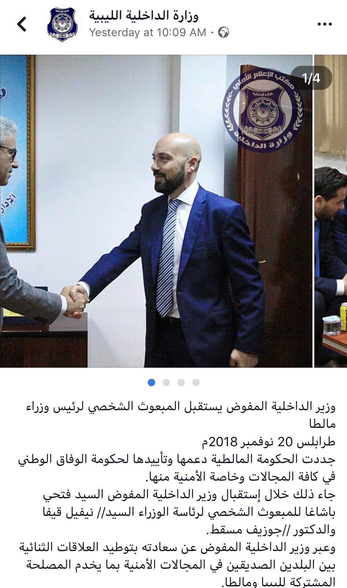 وكانت وزارة الداخلية بحكومة الوفاق قد نشرت أيضاً على صفحتها يوم أمس الثلاثاء بيانا عبر صفحتها على فيسبوك بعنوان “وزير الداخلية يستقبل المبعوث الشخصي لرئيس وزراء مالطا “. وقامت بحذفه اليوم الأربعاء بعد إنتشار الخبر .