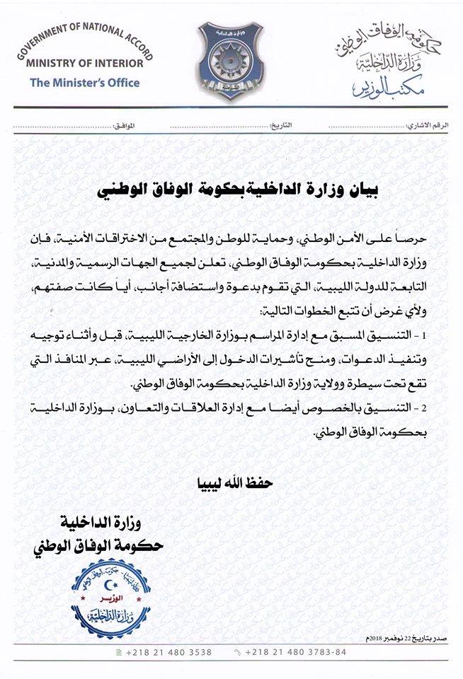 داخلية الوفاق طالبت في بيانها الذي تلقت المرصد نسخة منه جميع الجهات التي تريد إستضافة أجانب التنسيق المسبق مع إدارة المراسم بوزارة الخارجية الليبية قبل وأثناء توجيه وتنفيذ الدعوات، ومنح تأشيرات الدخول إلى الأراضي الليبية عبر المنافذ التي تقع تحت سيطرة وولاية داخلية الوفاق.