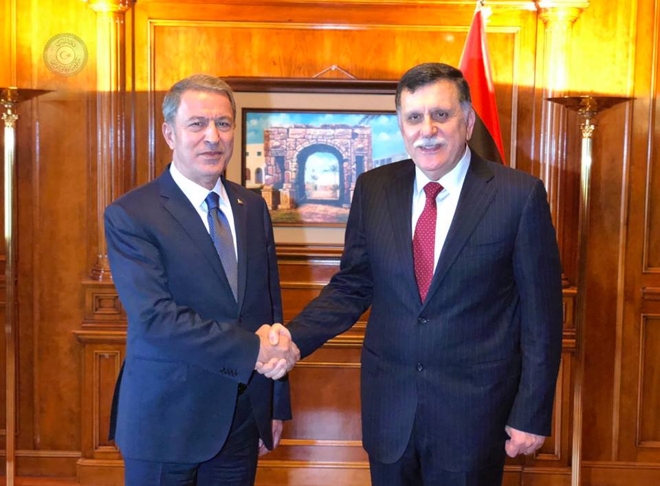 وقبل الزيارة المفاجئة بأربعة أيام فقط إستقبل السراج بمقره فى طرابلس وزير الدفاع التركي ” خلوصي أكار ” على رأس وفد كبير يضم رئيس الأركان العامة الفريق ” باشار غولار ” والممثل الخاص لرئيس الجمهورية عضو البرلمان عن العاصمة أنقرة ” أمر الله إيشلار ” وعدد من مسؤولي وزارة الدفاع والخارجية التركية.