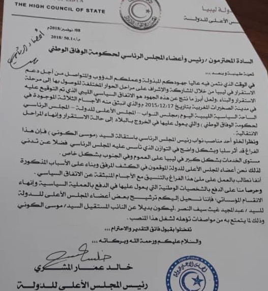 هذا وقد تحصلت المرصد على وثيقة أخرى تؤكد إستلام مدير مكتب رئيس الرئاسي فائز السراج يوسف المبروك لخطاب المشري يوم 19 نوفمبر الجاري ، وأرسل المبروك خطاباً إلى أعضاء الرئاسي بشان تلقيهم خطاب المشري بشأن ترشيح سيف النصر ليكون بديلاً للكوني.