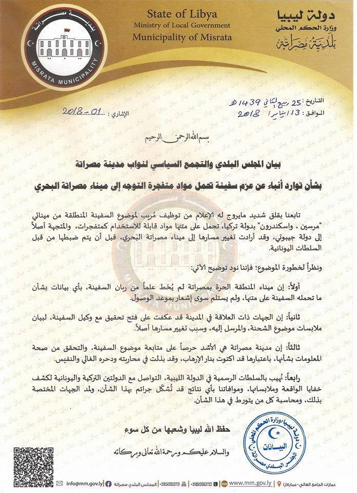 ولاحقاً أعلنت بلدية مصراتة بأن سفينة المتفجرات كانت متجهة بالفعل إلى ميناء المدينة قبل أن يتم ضبطها فى اليونان وإستنكرت البلدية فى بيان ما وصفته بـ” التوظيف المريب للواقعة ” .