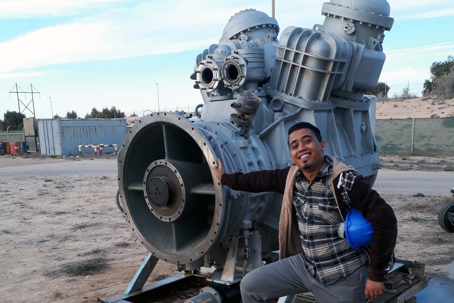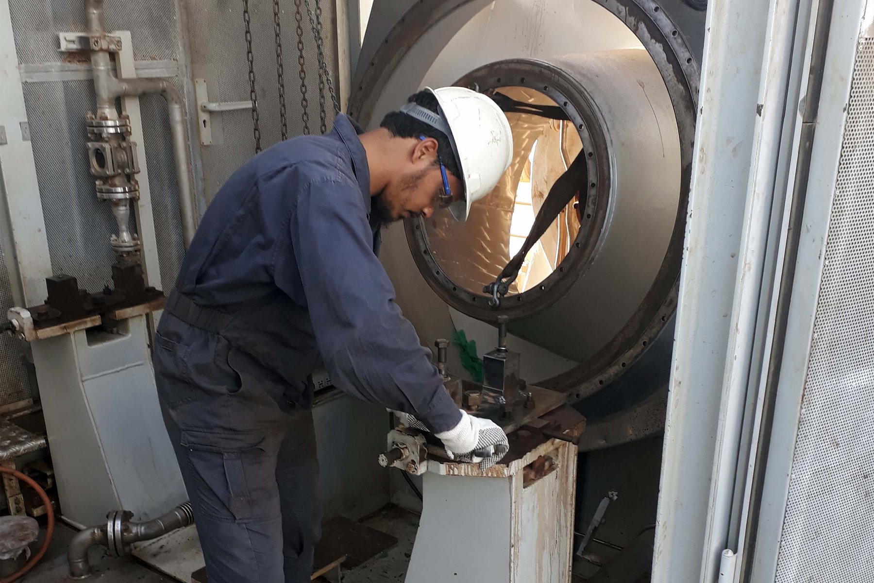 وأما الفريق الثاني برئاسة محمد سالم البدوي الذي تولى عملية تركيب المحرك بالضاغطة رقم 13 وأعمال الصيانة وتركيب جميع المفاتيح الكهربائية والكروت الخاصة بمنظومة التحكم وصيانة منظومة الاهتزازات ومنظومة الإطفاء واستبدال مبرد الزيت ومدخل الهواء الخاص بالضاغطة.
