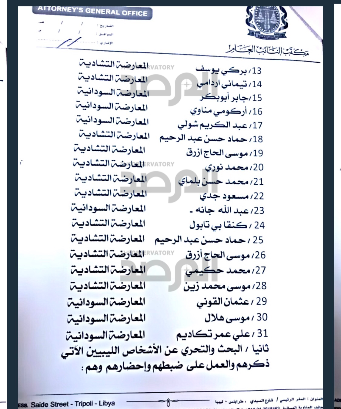 وطالب الصور بالبحث والتحري عن الوافدين المعارضين الاجانب وعددهم 31 عنصراً من المعارضة التشادية والسودانية كما طالب بضبط وإحضار بلحاج وجضران من الليبيين يضاف لهم شعبان هدية المكنى أبوعبيدة الزاوي زعيم مليشيا غرفة عمليات ثوار ليبيا وحمدان أحمد حمدان وعلي الهوني ومختار إرخيص .