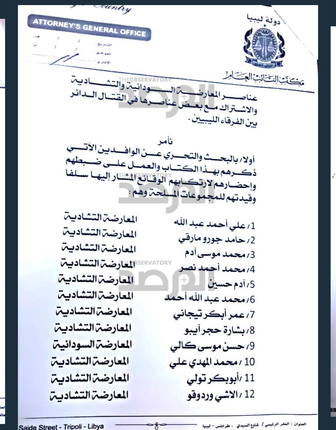 وأشار الكتاب أيضاً إلى البلاغات المحالة من قبل الجهات الضبطية لمكتب النائب العام ذات الصلة بارتكاب عدد من المواطنين الليبيين لوقائع الاستعانة ببعض عناصرالمعارضة السودانية والتشادية والاشتراك مع بعض عناصرها في القتال الدائر بين الفرقاء الليبيين.