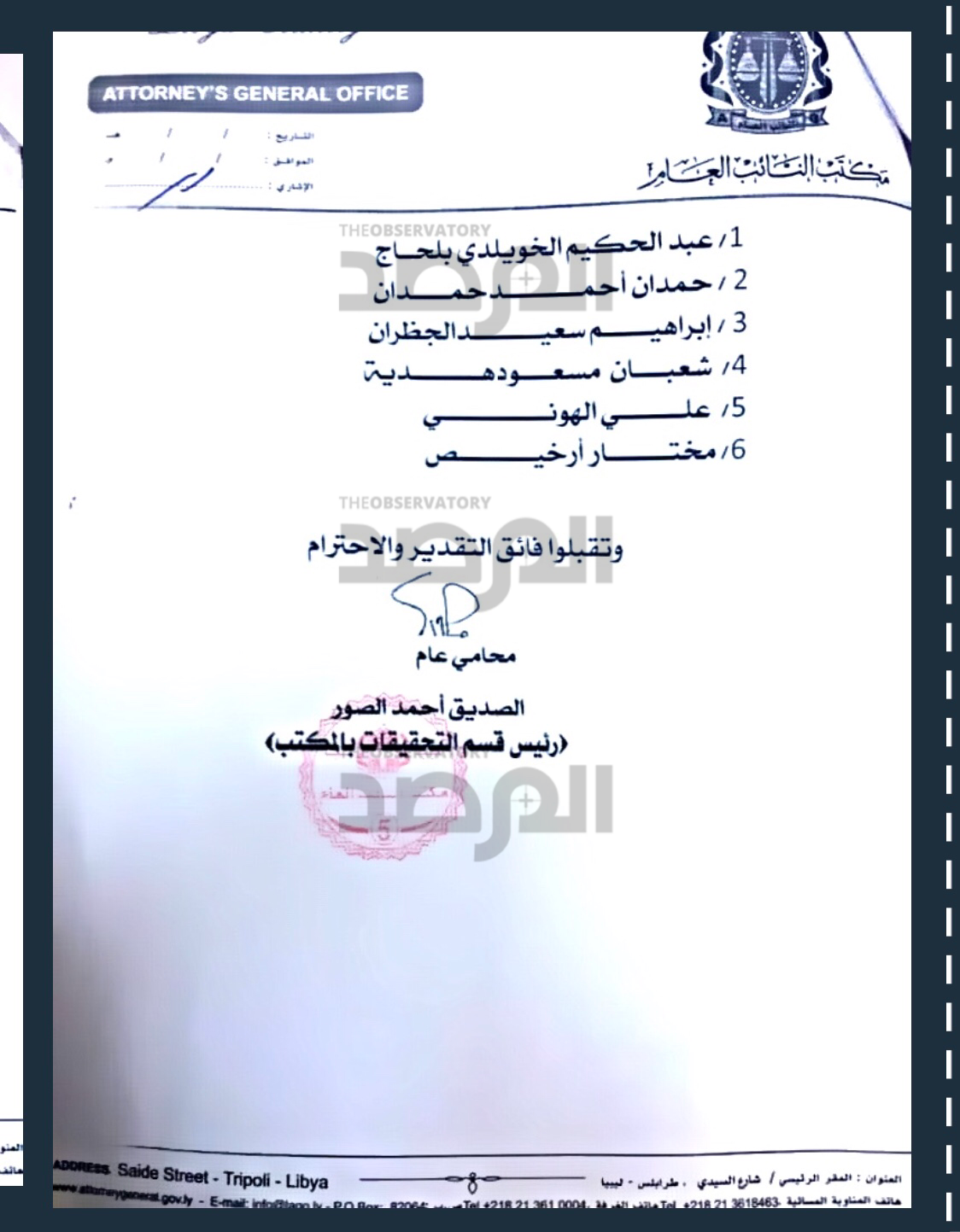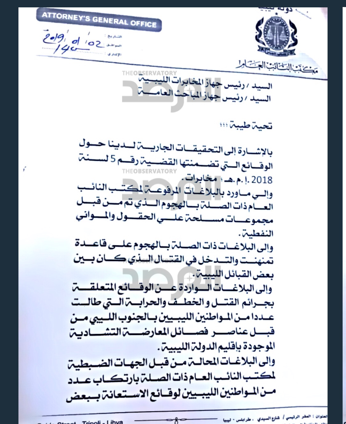 ووفقاً للكتاب الذي تلقت صحيفة المرصد نسخة عنه فقد جاء الأمر بالإشارة إلى التحقيقات الجارية حول الوقائع التي تضمنتها القضية رقم لسنة 50 /2018 مخابرات وإلي ماورد بالبلاغات المرفوعة لمكتب النائب العام ذات الصلة بالهجوم الذي تم من قبل مجموعات مسلحة علي الحقول والمواني النفطية.