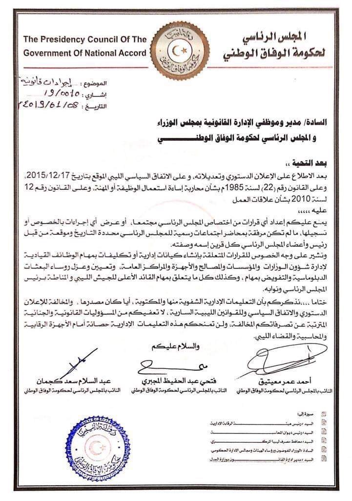 ليبيا – حذر ثلاثة من أعضاء المجلس الرئاسي مدير وموظفي الإدارة القانونية بمجلس الوزراء وكافة أعضاء المجلس الرئاسي لحكومة الوفاق من مغبة تنفيذ القرارات الفردية الصادرة عن رئيس الرئاسي فائز السراج .