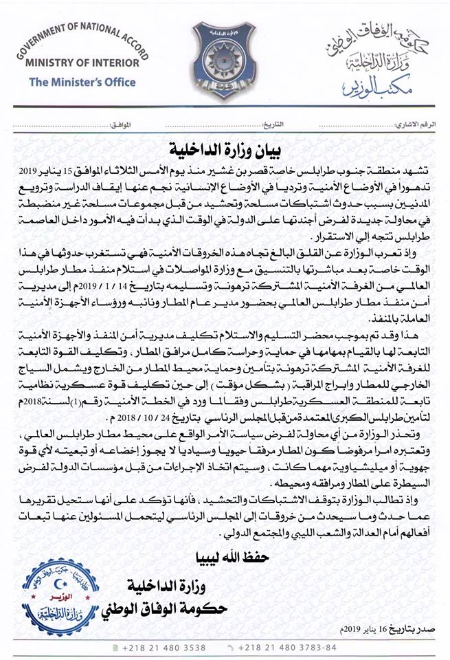 وفى وقت سابق من اليوم الأربعاء أصدرت وزارة الداخلية بحكومة الوفاق بياناً أكدت فيه بأن منطقة طرابلس وخاصة قصر بن غشير تشهد منذ يوم الأمس الثلاثاء تدهوراً في الأوضاع الأمنية وتردياً في الأوضاع الإنسانية نجم عنه إيقاف الدراسة وترويع المدنيين .