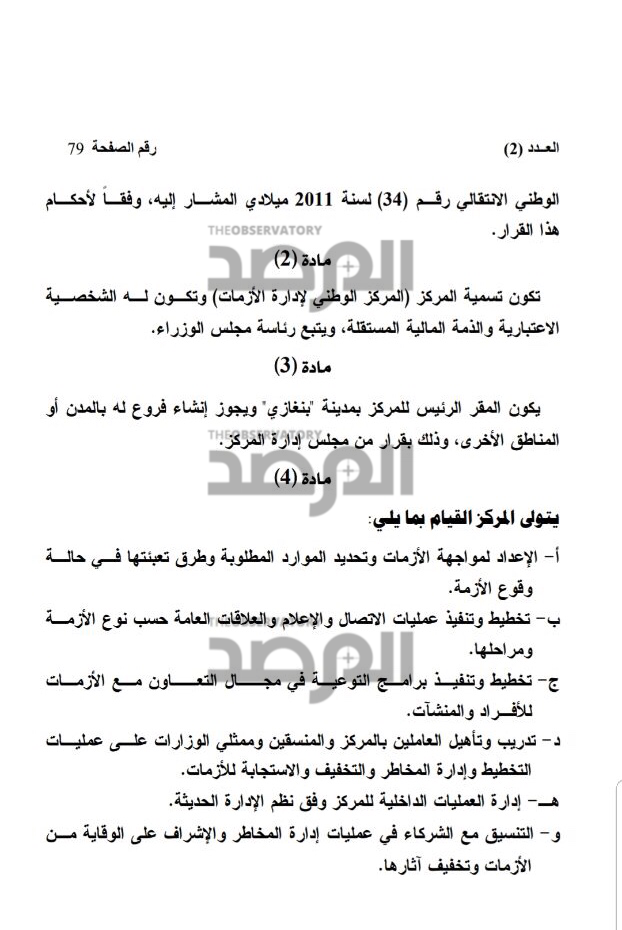 وقبل ذلك وتحديداً فى أبريل 2012 أعيدت تسمية المركز الليبي القطري باسم المركز الليبي للأزمات وفقاً لقرار صادر عن مجلس الوزراء فى ذلك الوقت وتحصلت صحيفة المرصد عليه حيث يشير القرار الى تخصيص ميزانية للمركز من الميزانية العامة على ان يكون له الحق فى تلقي الهبات والمساعدات والتبرعات وهو الأمر الذي تولته الاستخبارات القطرية عبر دفع أموال له تحت هذا الباب فيما واصلت قناة الجزيرة تغطيتها وإستضافتها وإهتمامها البالغ بناصر المانع دوناً عن بقية أعضاء الجماعة .