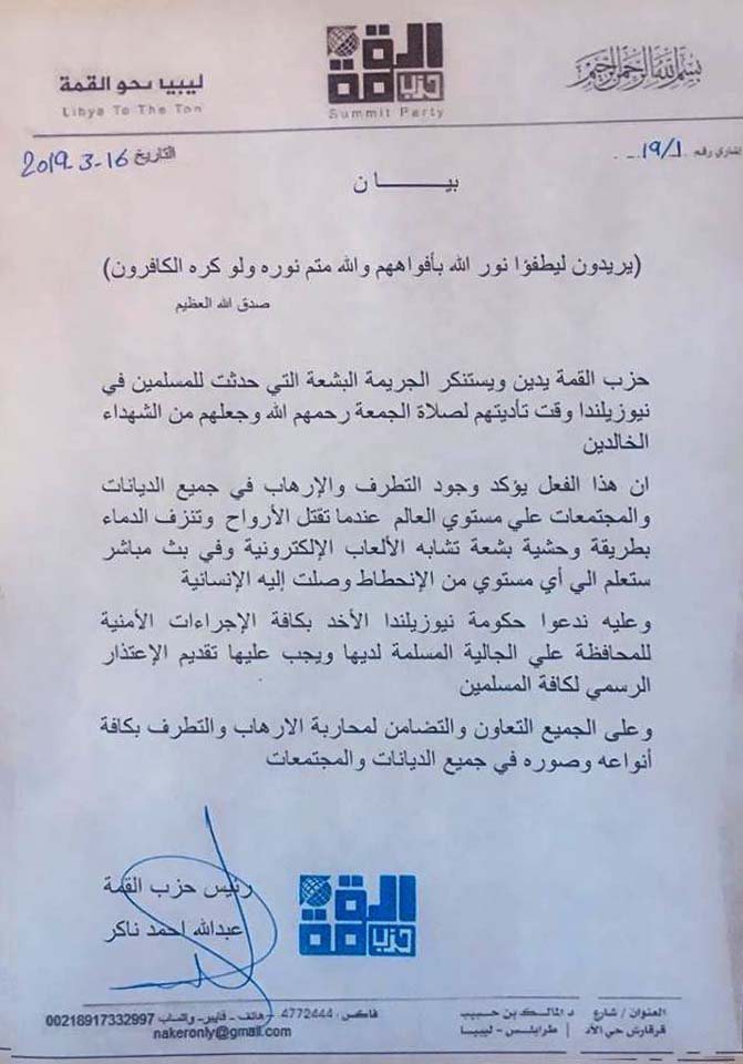 ليبيا – أعرب رئيس حزب القمة عبدالله ناكر عن إدانته لهجوم نيوزيلندا الذي إستهدف إثنين من مساجد المسلمين وأدى لوفاة 49 مصلي في آخر حصيلة وذلك أثناء أداء صلاة الجمعة .