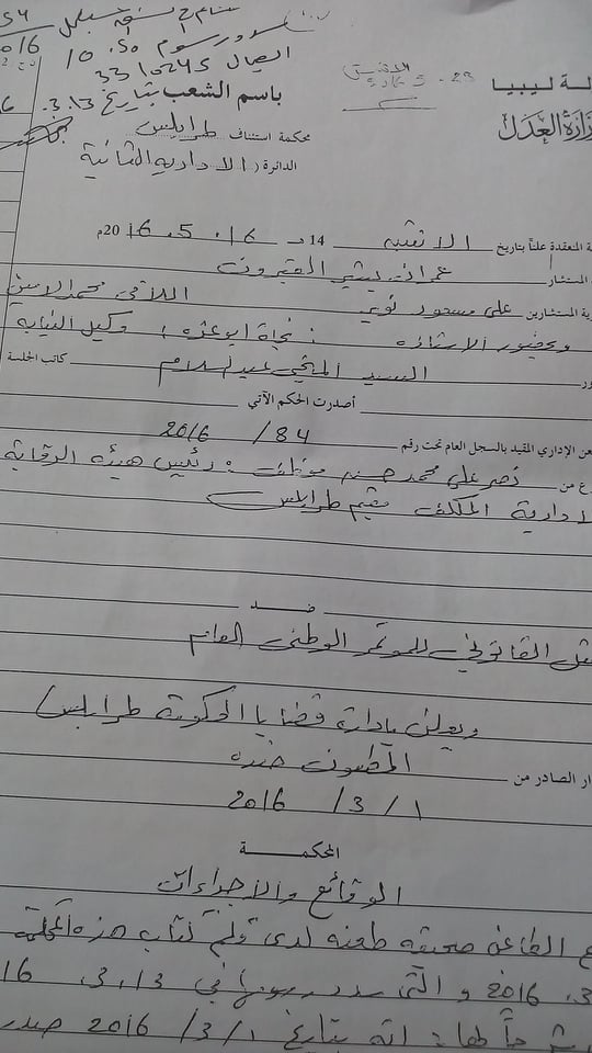 ليبيا – في 21 مارس الجاري نشرت صحيفة المرصد تقريراً عن إصدار القضاء الإداري في طرابلس حكماً يقضي ضمنياً بطلان تولي نصر حسن بريدعة المشاي لمنصب رئيس هيئة الرقابة الإدارية .