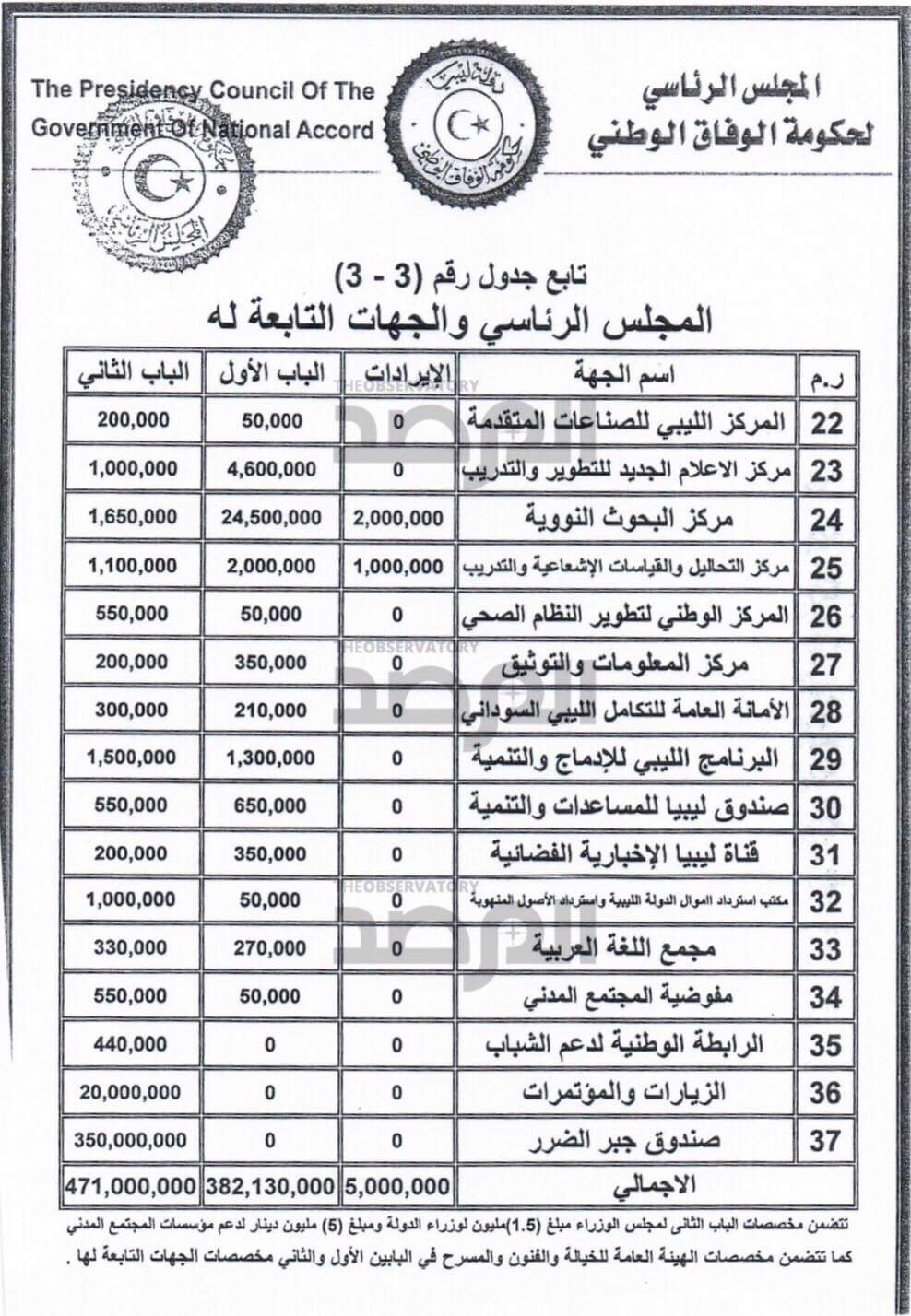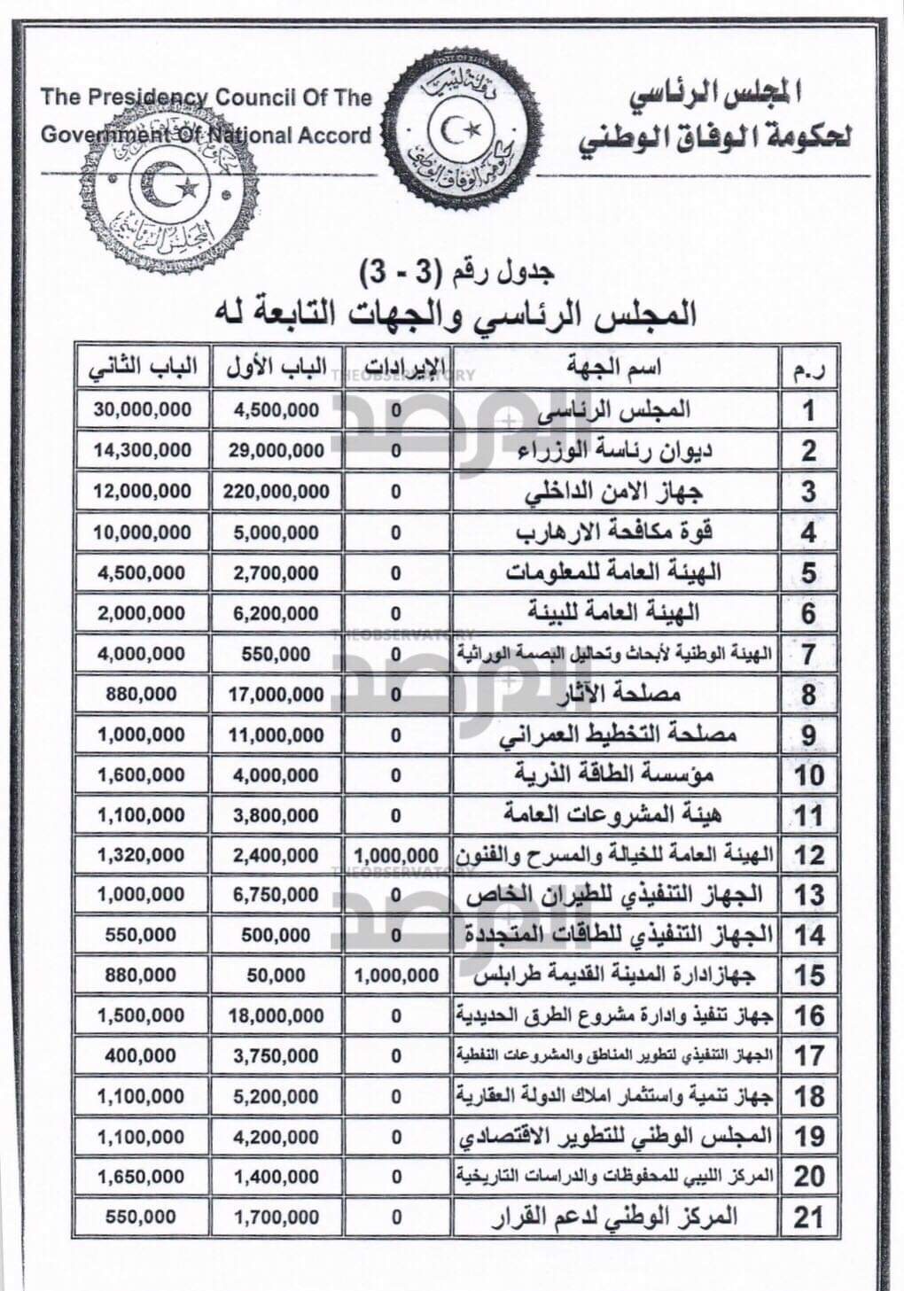 أما المجلس الرئاسي فتبلغ مرتباته من أعضاء وعاملين 4.5 مليون دينار فيما تبلغ تسييرته ومصروفاته 30 مليون دينار ، ويظهر في ذات الجدول بأن ميزانية الرئاسي منفصلة عن ميزانية ديوان رئاسة الوزراء رغم أنهما يمارسان ذات الاختصاص الامر الذي إعتبره رئيس ديوان المحاسبة مخالفة غير مبررة سبق وأن تم التنبيه عليها .